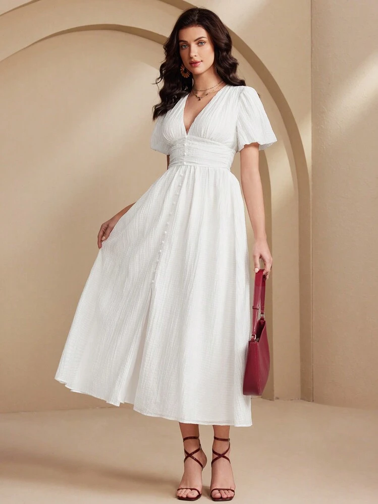 Ta biała sukienka w stylu midi zachwyci Cię swoją prostotą i elegancją. Wykonana z lekkiego materiału, posiada dekolt typu V oraz krótki rękaw. Dodatkowym elementem ozdobnym są guziki, które dodają sukience wyjątkowego uroku. Idealna na letnie dni oraz specjalne okazje.