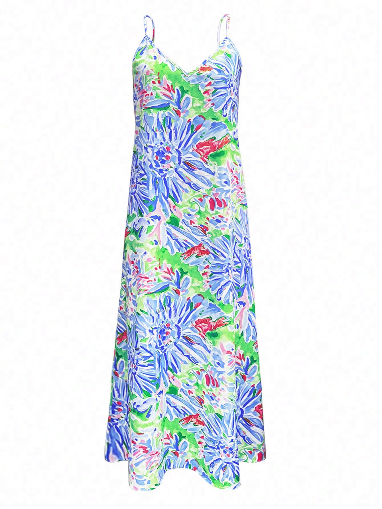 Kolorowa sukienka maxi o świeżym, wielokolorowym wzorze na białym tle. Z dekoltem typu serek oraz wygodnymi ramiączkami. Idealna na letnie wyjścia i spacery po plaży.
