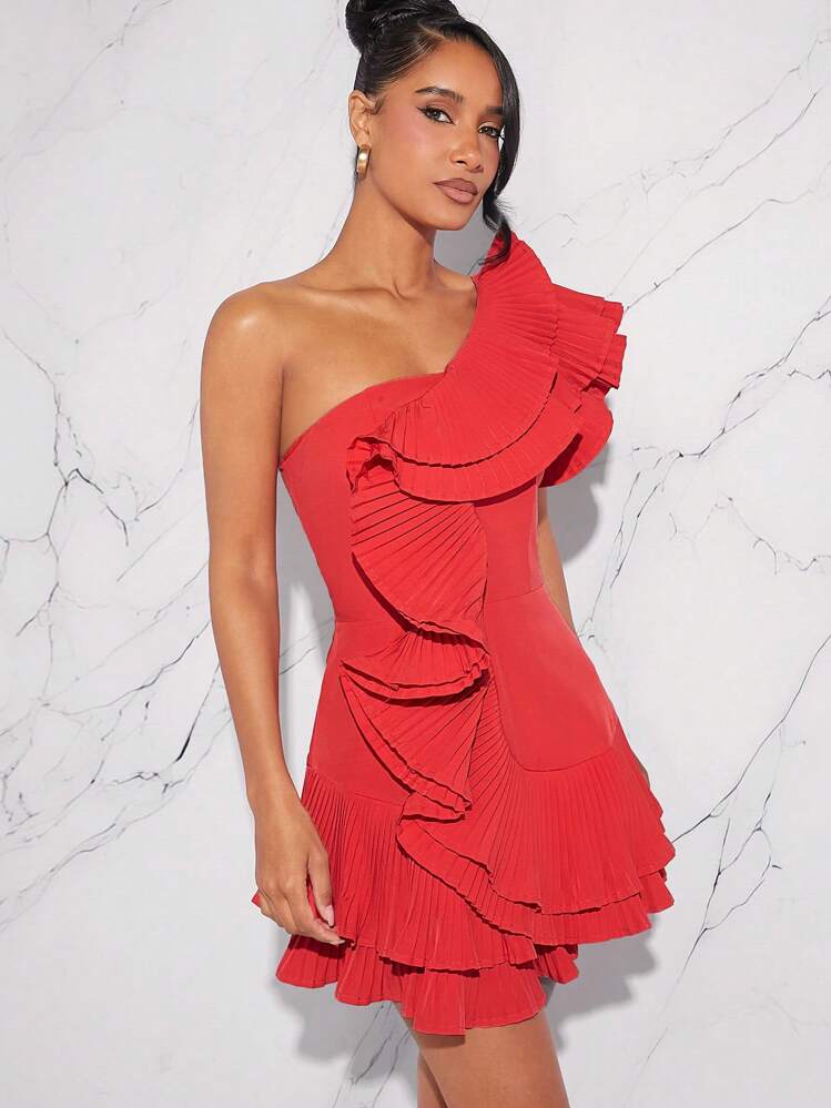 Ta piękna czerwona sukienka jest plisowana i ozdobiona falbanami, co nadaje jej nieco romantycznego charakteru. Asymetryczny dekolt oraz krótkie rękawy dodają lekkości i swobodnego wyglądu. Doskonała propozycja na letnie dni.