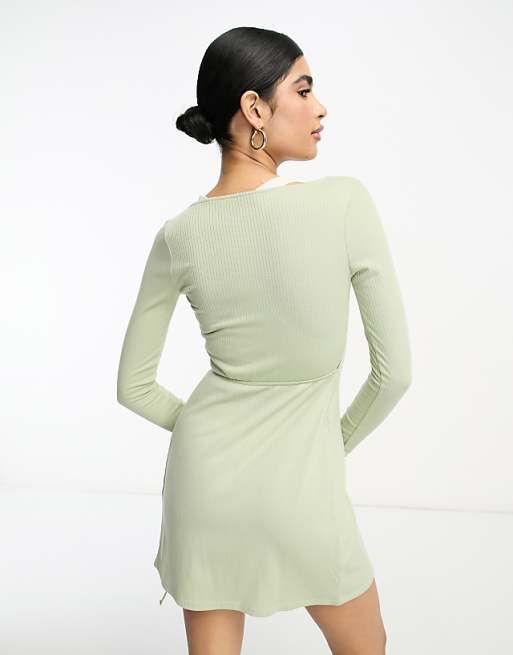 Mini sukienka w prążki w kolorze zielonym. Wykonana z lekkiego materiału, dopasowana w talii. Dekolt typu kopertowego nadaje jej eleganckiego charakteru, a długi rękaw dodaje kobiecości.