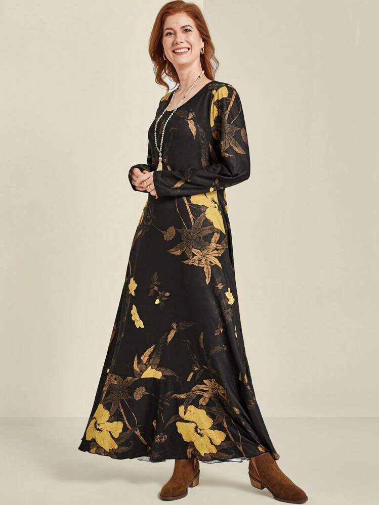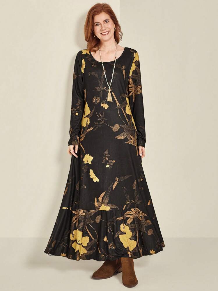Ta czarna sukienka maxi z okrągłym dekoltem i długim rękawem to must-have dla każdej garderoby. Jej wzór dodaje jej niepowtarzalnego charakteru, a klasyczny kolor sprawia, że idealnie pasuje do wielu stylizacji.