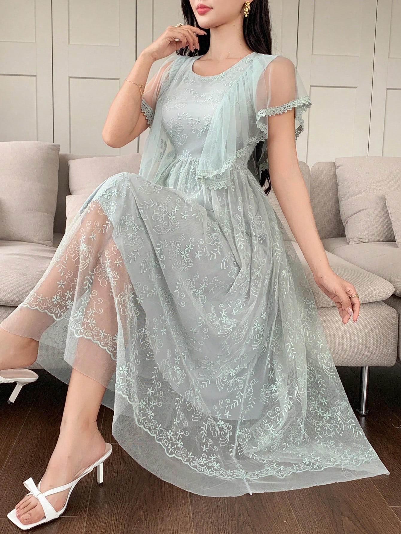 Ta zielona midi sukienka z haftami będzie doskonałą propozycją dla miłośniczek wygodnego stylu. Dekolt w kształcie okrągłego kołnierzyka i krótkie rękawy dodają jej uroku i lekkości.