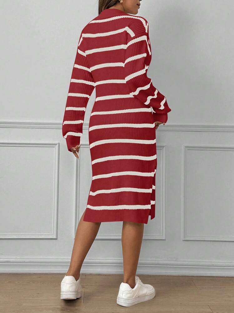 Ta uwodzicielska czerwona sukienka z dzianiny jest nie tylko stylowa, ale także bardzo wygodna. Rzucające się w oczy paski nadają jej jeszcze większy urok. Dekolt w serek i długi rękaw dodają elegancji. Idealna na wieczorne wyjścia lub spotkania biznesowe.