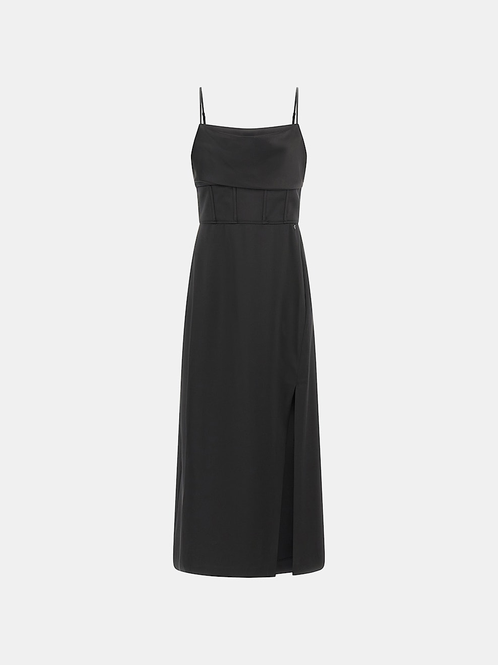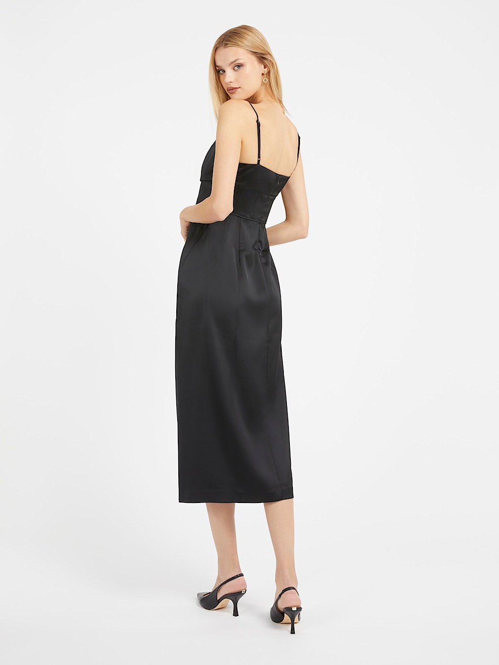 Elegancka i klasyczna sukienka na każdą okazję. Wykonana z delikatnej satyny, o długości midi. Prostokątny dekolt i ramiączka dodają subtelności, a czarny kolor pasuje do wszystkich stylizacji.