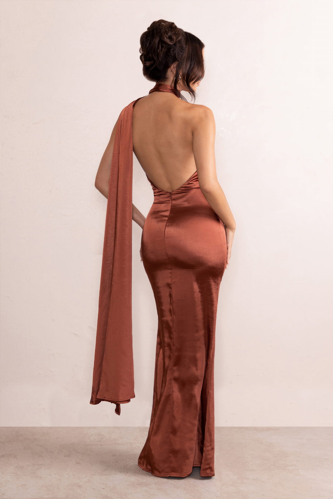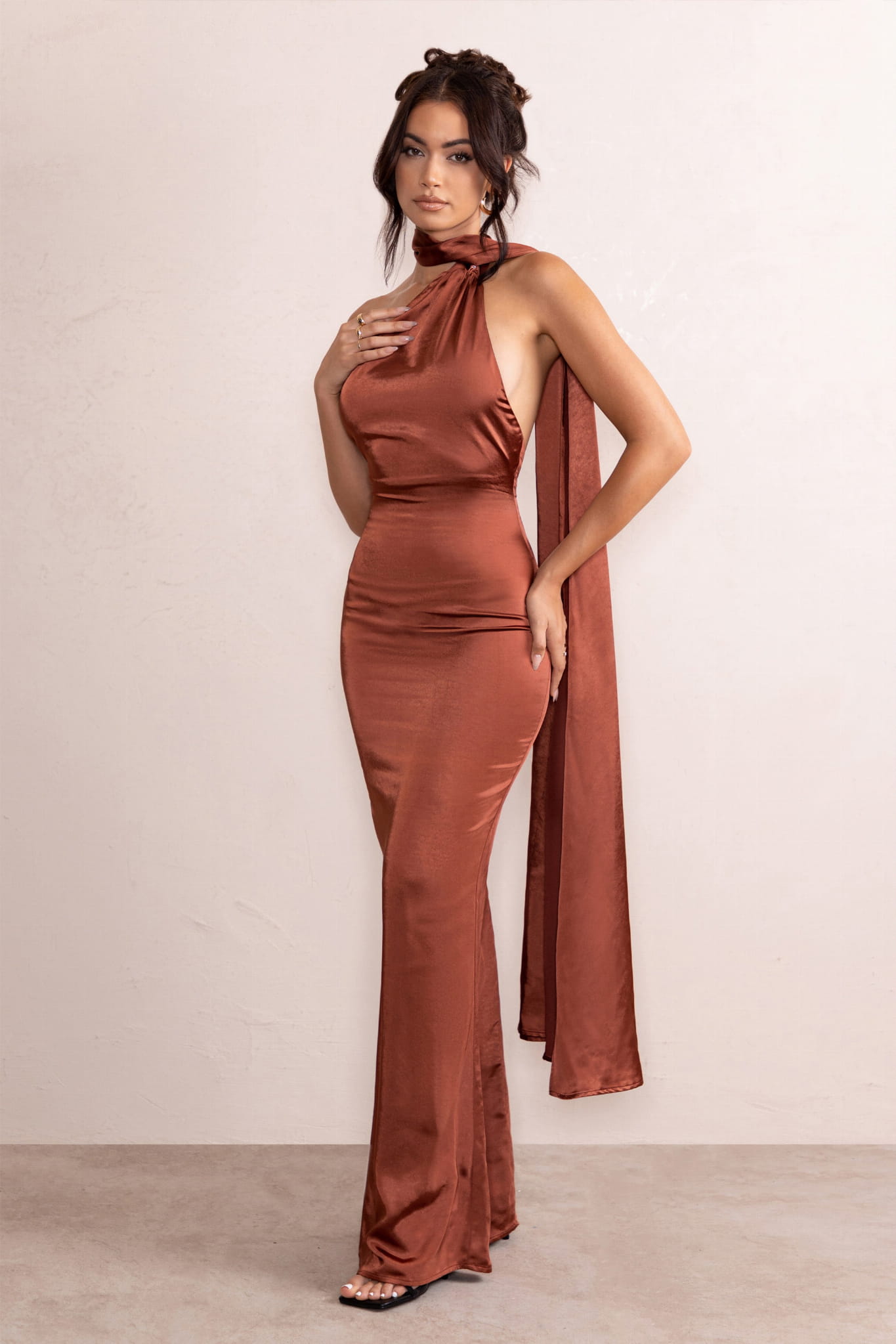 Brązowa satynowa sukienka maxi (44)