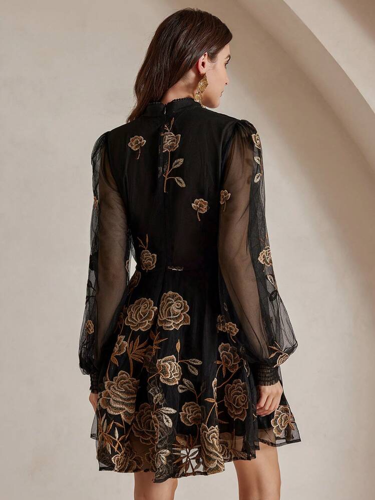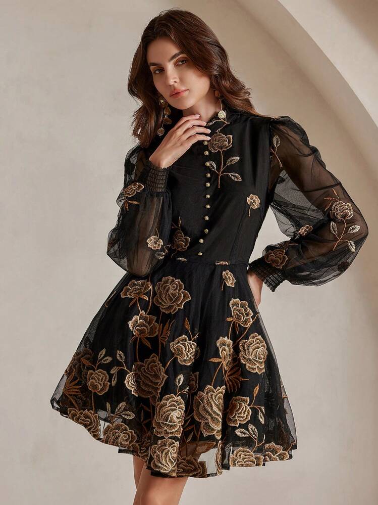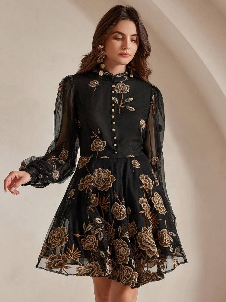 Ta stylowa, czarna sukienka z długimi rękawami i stójką to idealna propozycja na wiele okazji. Wykonana z wysokiej jakości materiału, zapewnia komfort i elegancję. Doskonale sprawdzi się w jesienne i zimowe dni.