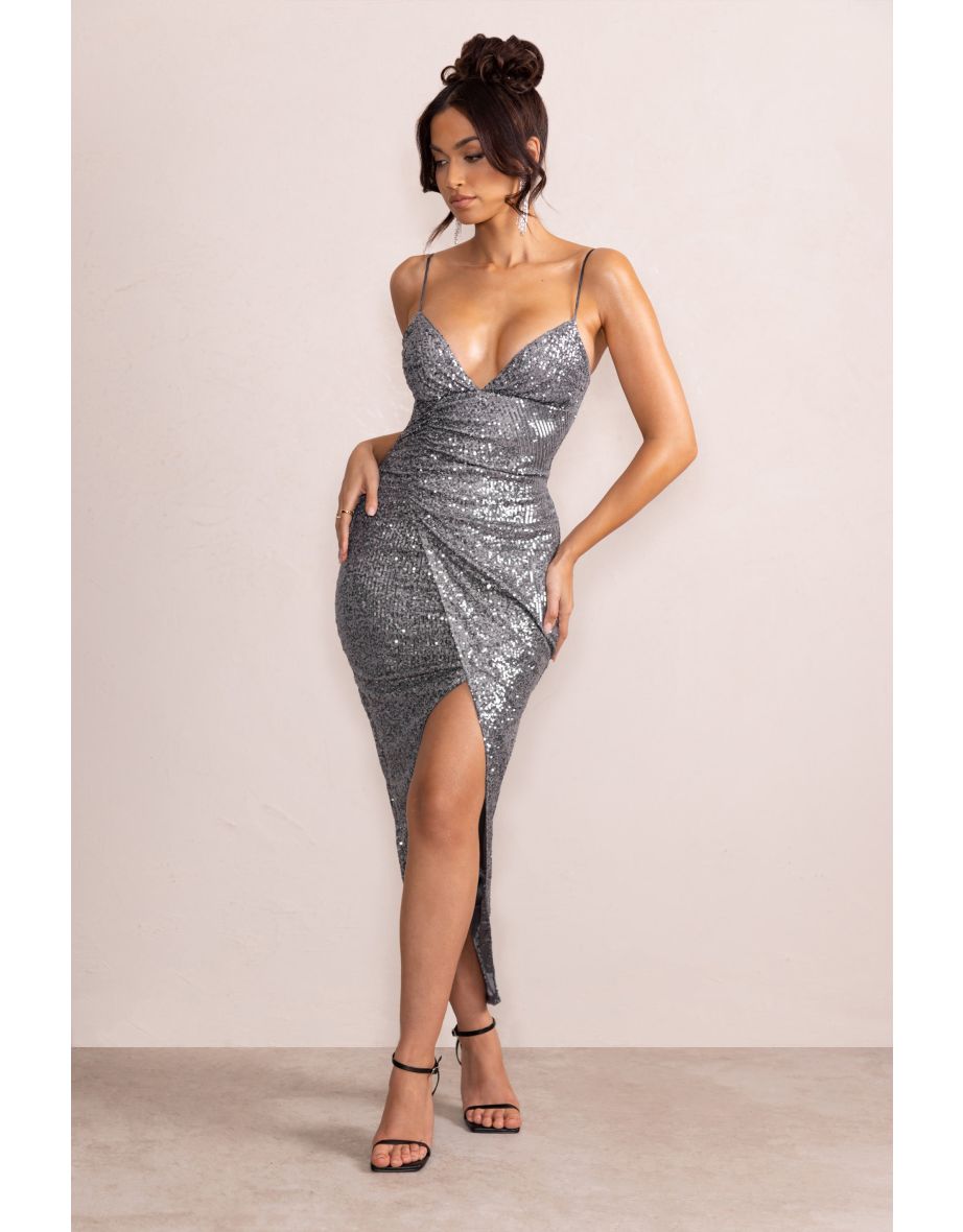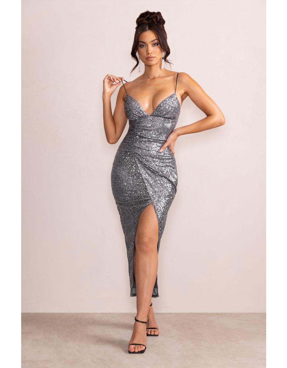 Ta piękna cekinowa sukienka w kolorze srebrnym jest idealna na wyjątkowe okazje. Posiada głęboki dekolt oraz ramiączka, które subtelnie podkreślają piękną sylwetkę. Odważna i efektowna, będzie doskonałym wyborem na wieczorne spotkania i imprezy.