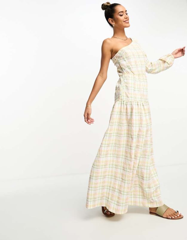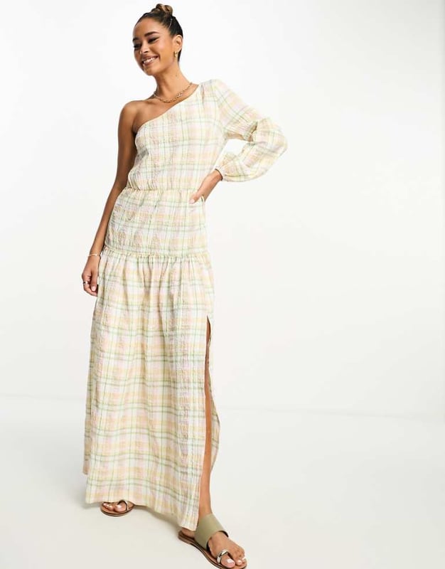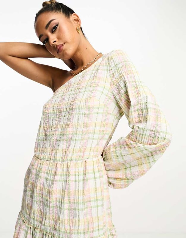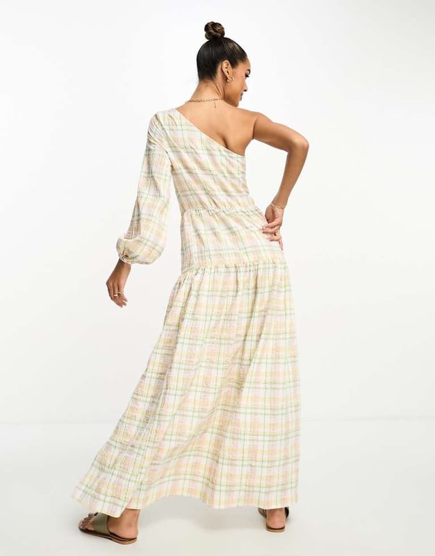 Elegancka sukienka z kratką w kolorze ecru o asymetrycznym dekolcie na jedno ramię. Wykonana z miękkiej tkaniny, posiada długi rękaw, który dodaje jej uroku i elegancji. Idealna na wieczorne wyjścia i okazjonalne spotkania.