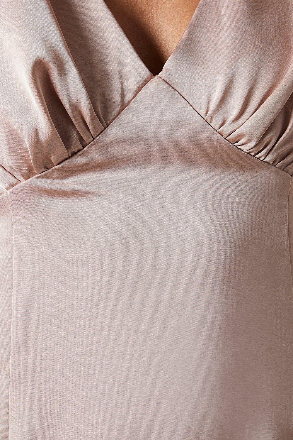 Elegancka sukienka maxi wykonana z satyny. Posiada dekolt w serek, który pięknie eksponuje szyję, dodając sukience szyku. Długie rękawy dodają klasy i sprawiają, że sukienka jest odpowiednia na wiele okazji.