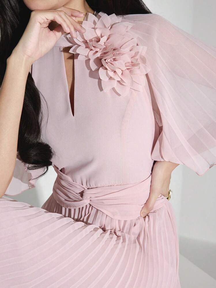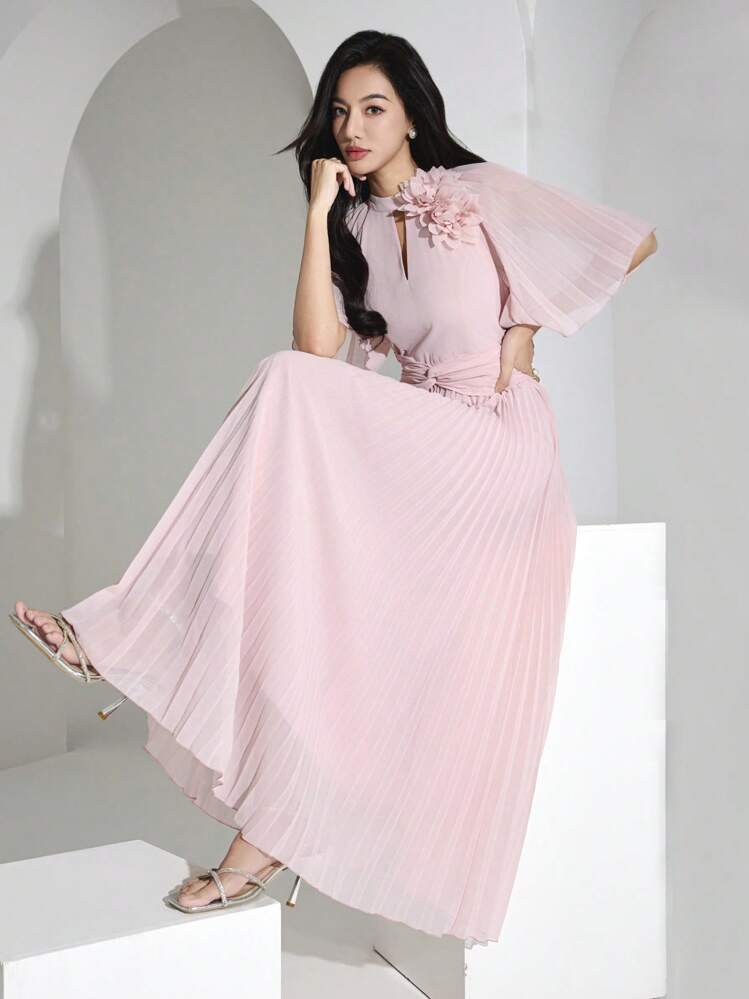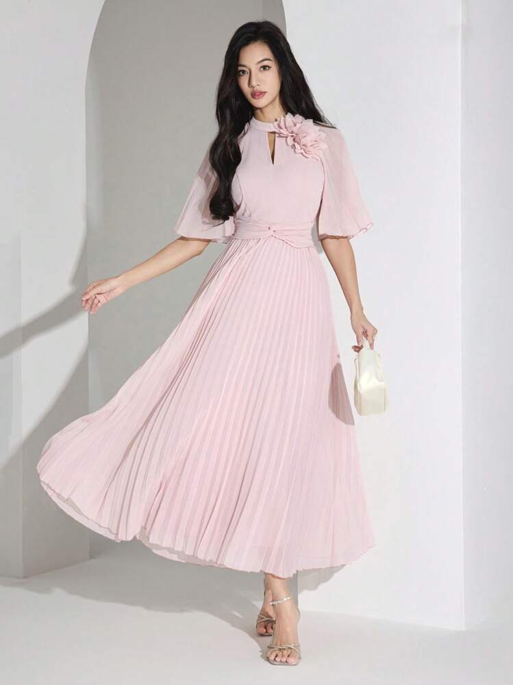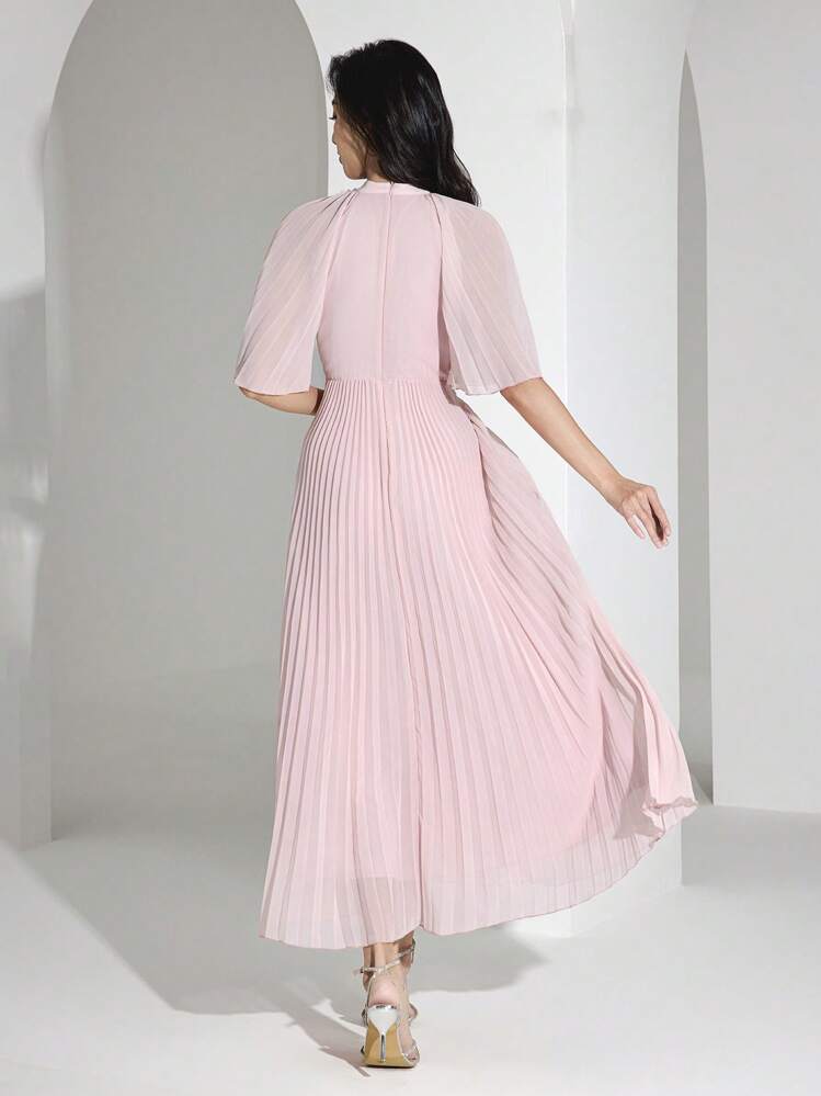 Ta urocza różowa sukienka jest idealnym wyborem dla każdej kobiety. Wykonana z delikatnych plis, dodaje jej dziewczęcego uroku. Dekolt typu stójka oraz krótki rękaw zapewniają wygodę i styl.