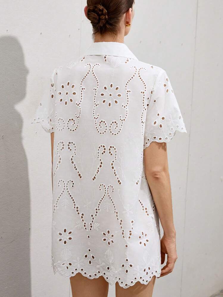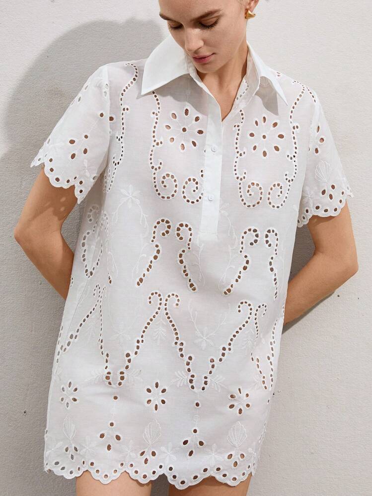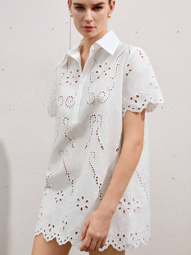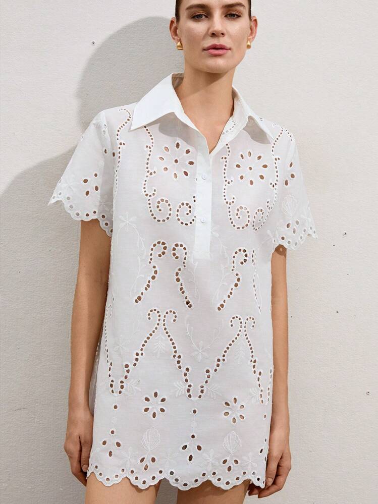 Klasyczna i elegancka biała sukienka mini z haftami to idealny wybór na letnie dni. Jej kołnierzyk i krótkie rękawy dodają jej uroku i sprawiają, że wyglądasz wyjątkowo.