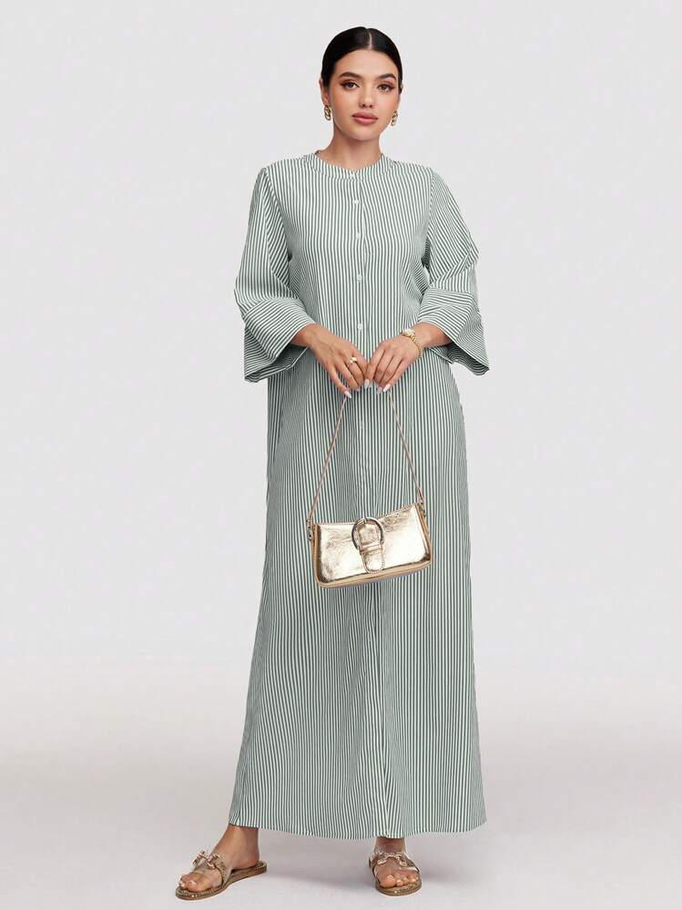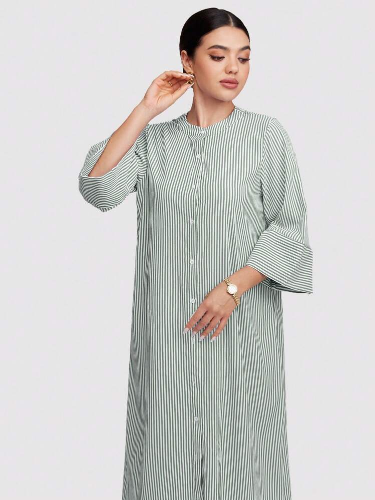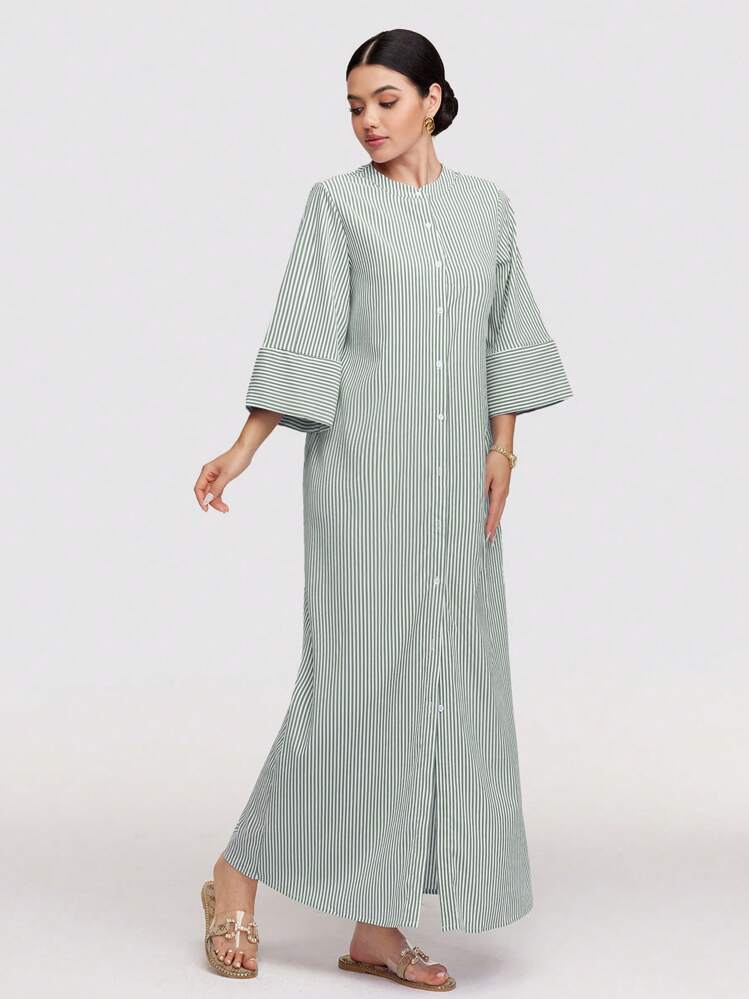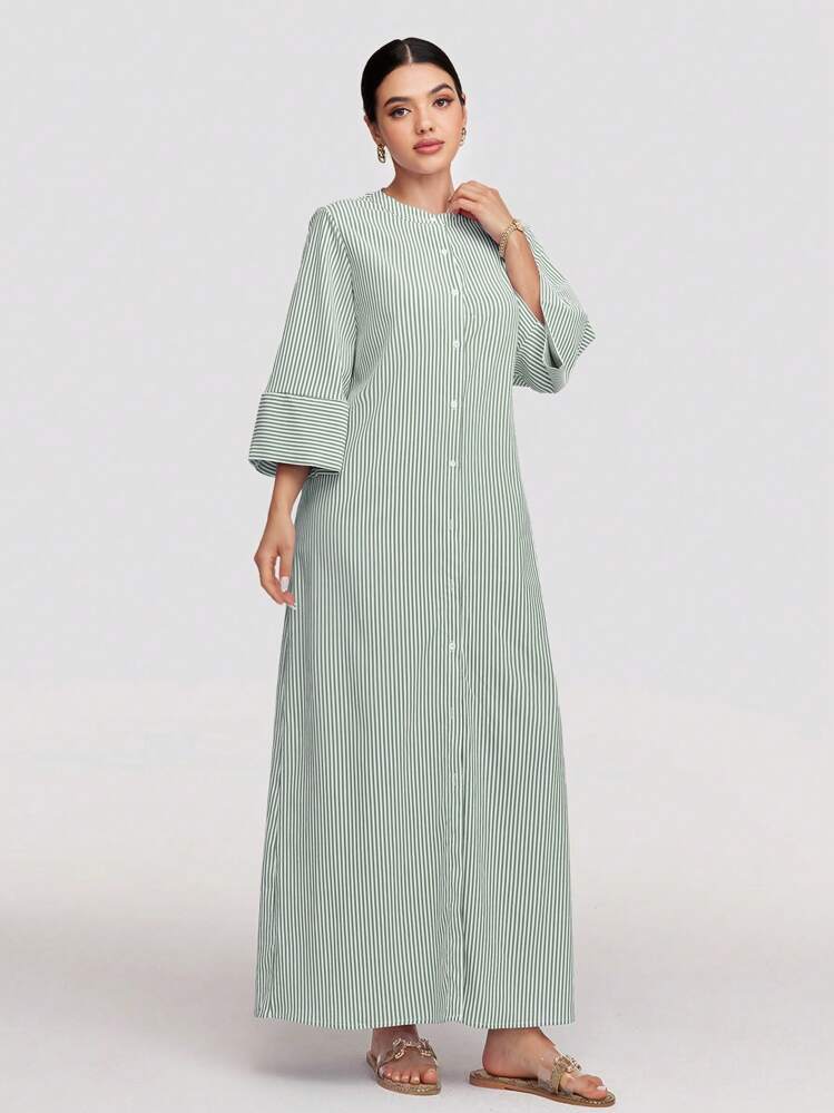 Dwukolorowa sukienka z paskami w wielu kolorach, idealna na każdą okazję. Posiada okrągły dekolt i 3/4 rękawy, co dodaje jej elegancji i wygodnego noszenia. Stwórz modny look dzięki tej sukience!