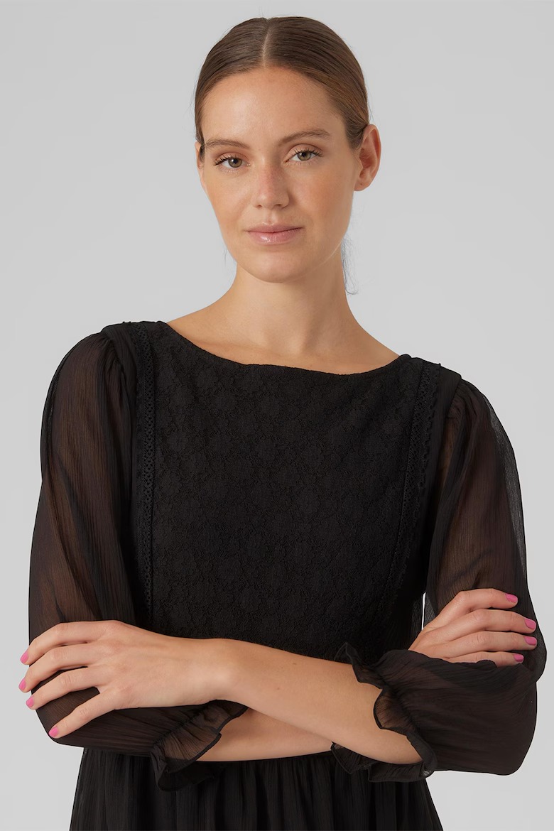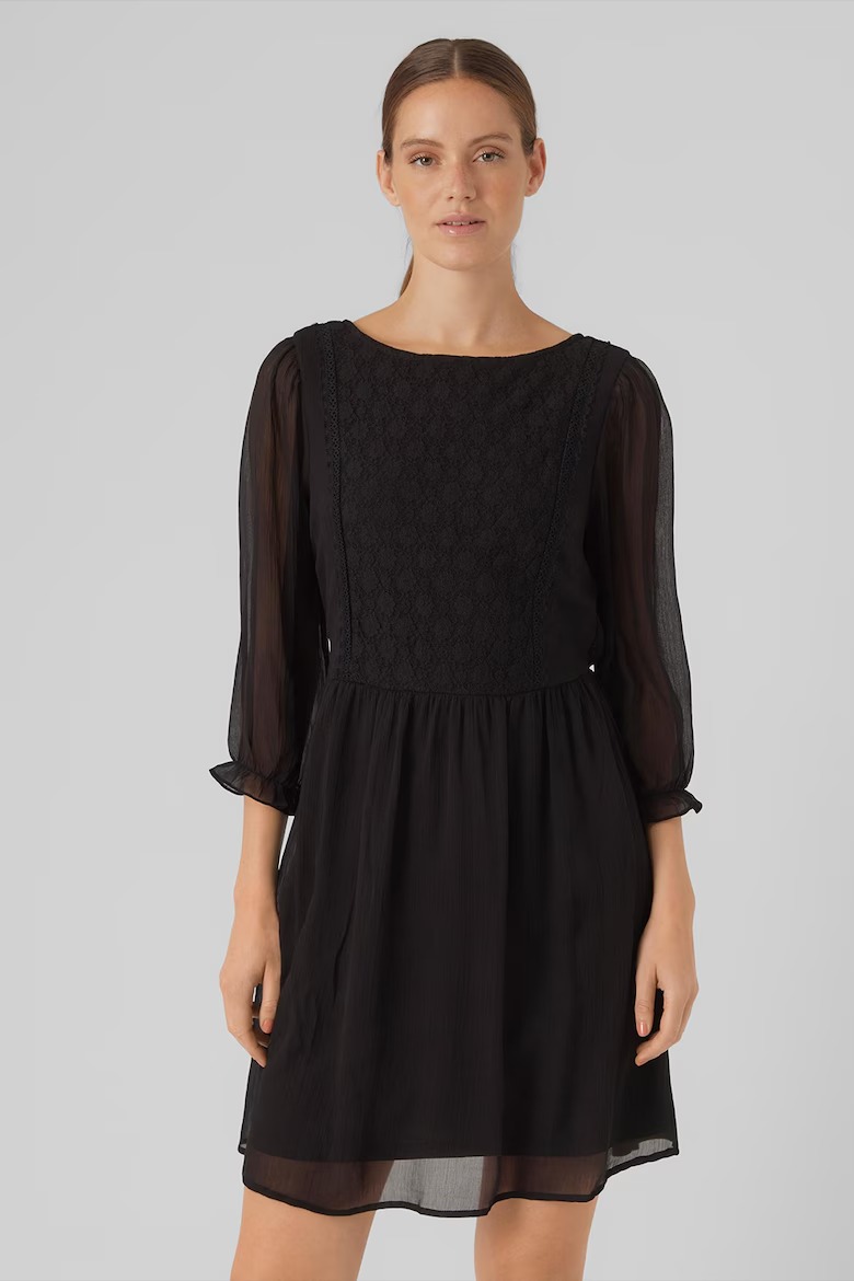 Ta modna i elegancka czarna sukienka mini jest niezbędną częścią garderoby każdej kobiety. Wygodny okrągły dekolt oraz krótki rękaw 3/4 dodają jej niepowtarzalnego charakteru. Może być noszona na wiele różnych okazji, zarówno na co dzień, jak i na wyjątkowe wyjścia.