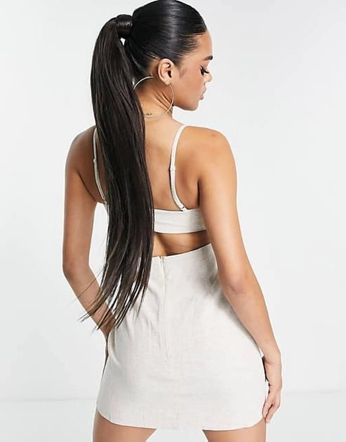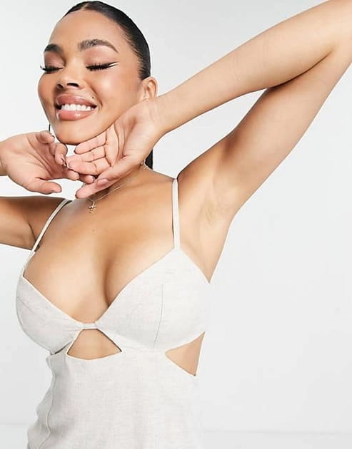 Elegancka i modna sukienka mini w kolorze beżowym z kuszącym wycięciem na biuście. Posiada dekolt typu serek oraz regulowane ramiączka. Idealna dla każdej kobiety, która lubi wyglądać stylowo i kobieco.