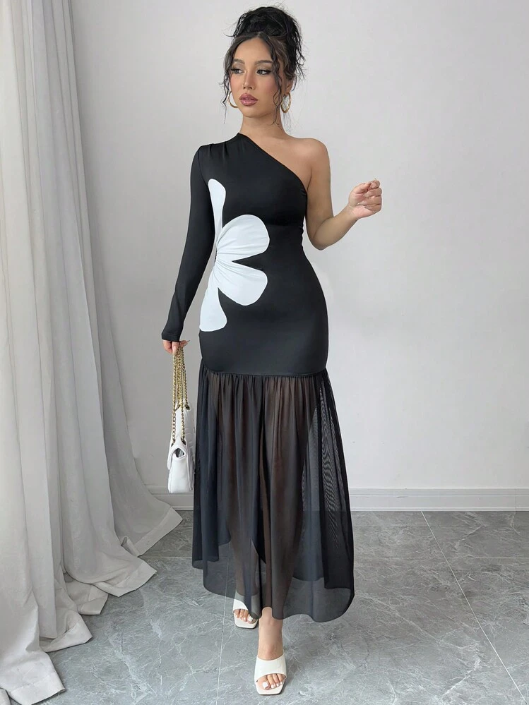 Elegancka i stylowa czarna sukienka z asymetrycznym dekoltem i długim rękawem. Wyrafinowany nadruk nadaje jej wyjątkowego charakteru. Doskonały wybór na wieczorne wyjścia i specjalne okazje.