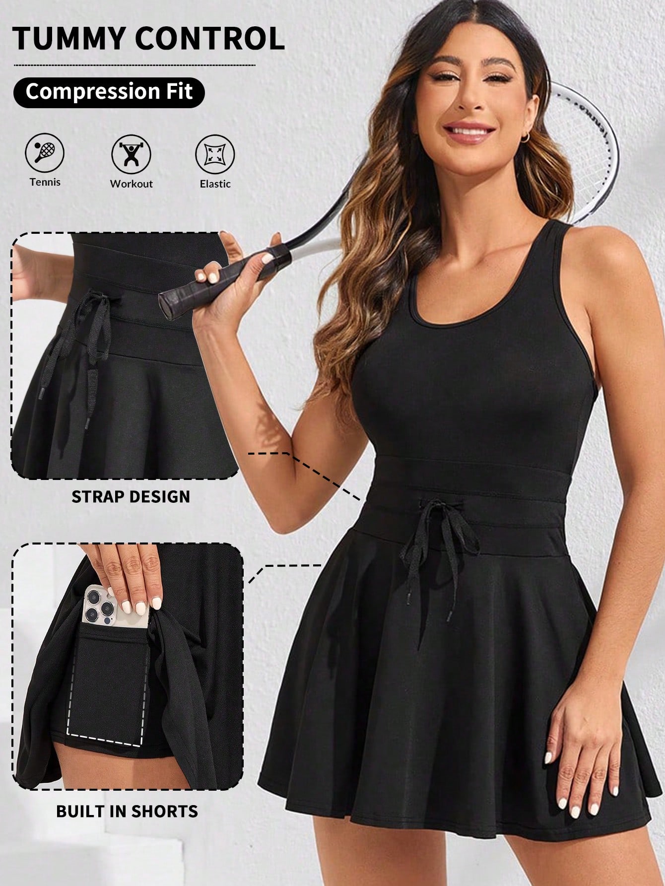 Elegancka i wygodna czarna sukienka kombinezon 2w1 to must-have w każdej garderobie. Posiada okrągły dekolt i bezrękawniki, dzięki czemu idealnie sprawdzi się jako strój na różne okazje.