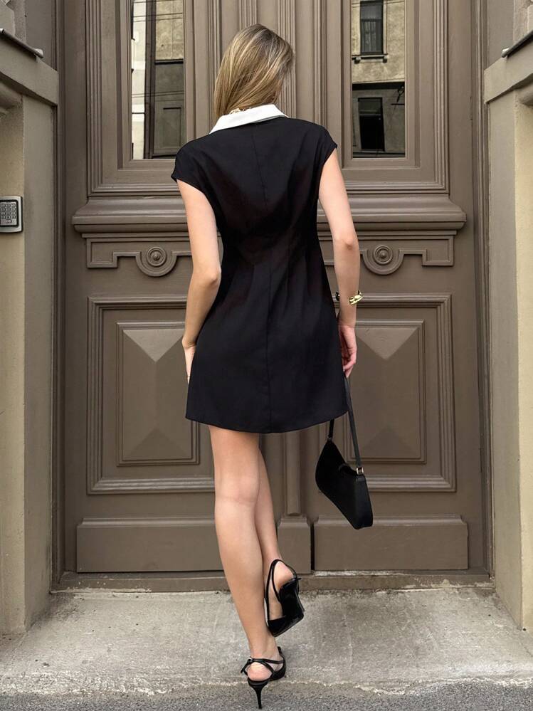 Elegancka czarna sukienka mini z wyraźnie zaznaczonym kołnierzykiem. Posiada dekolt w kształcie litery V oraz krótkie rękawy, co nadaje jej jesienno-zimowego charakteru. Idealna na wieczorne wyjścia lub spotkania biznesowe.