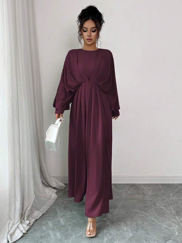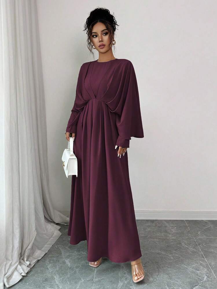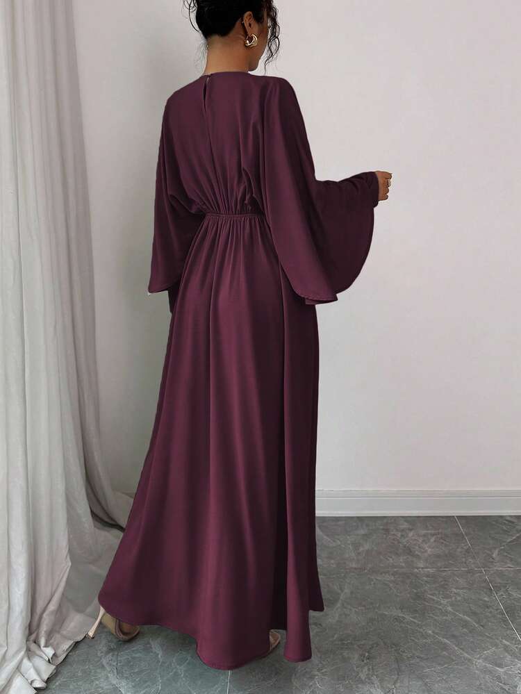 Elegancka sukienka maxi w głębokim odcieniu burgundu. Wykonana z delikatnego materiału, idealnie układa się na sylwetce. Posiada okrągły dekolt i długi rękaw, co dodaje jej klasy i szyku. Doskonały wybór na wieczorne wyjścia i specjalne okazje.