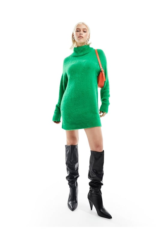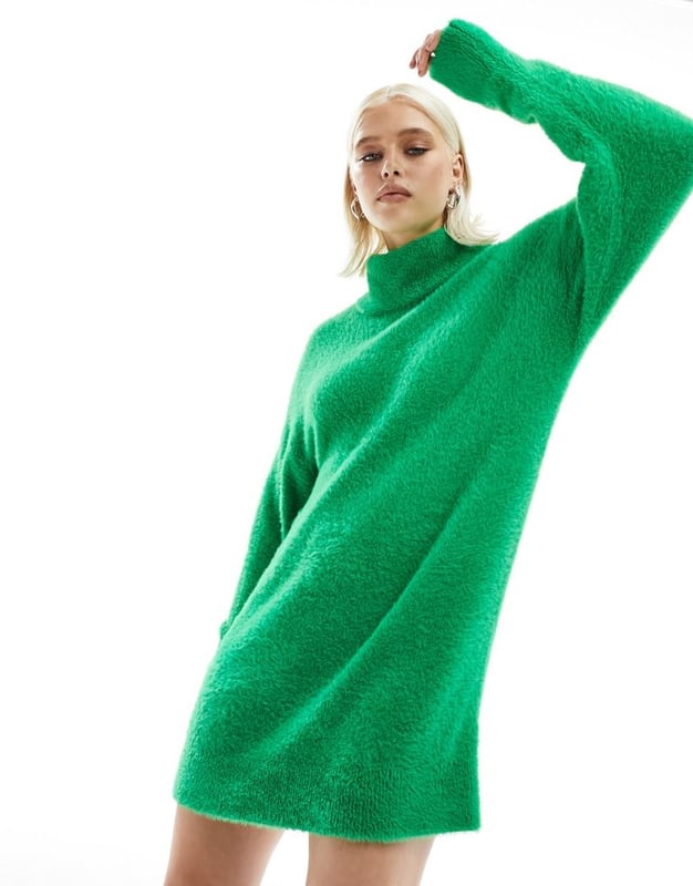 Ta zielona mini sukienka z dekoltem w kształcie golfu i długim rękawem idealnie nadaje się na chłodniejsze dni. Jest bardzo wygodna i dopasowana do sylwetki, a jednocześnie dodaje uroku dzięki swojemu energetycznemu kolorowi.