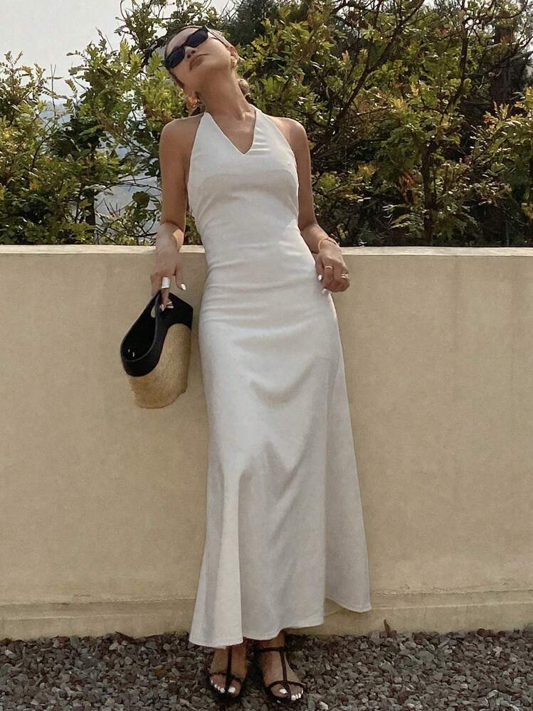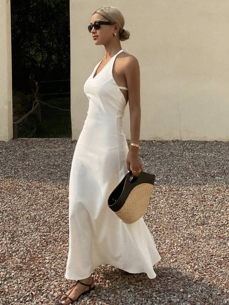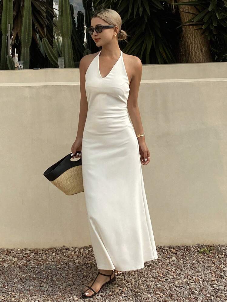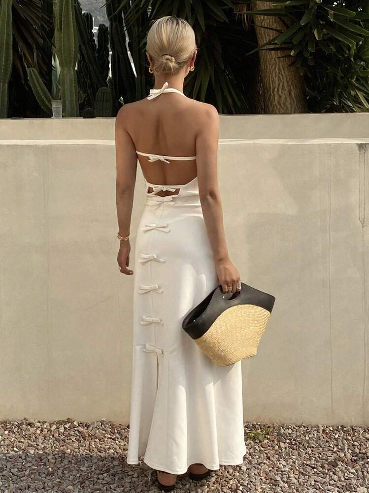 Elegancka maxi sukienka w kolorze białym z odkrytymi plecami i uroczymi kokardkami. Bez rękawów, idealna na letnie, wieczorne wyjścia. Materiał gładki i przewiewny, zapewniający komfort i wygodę noszenia.