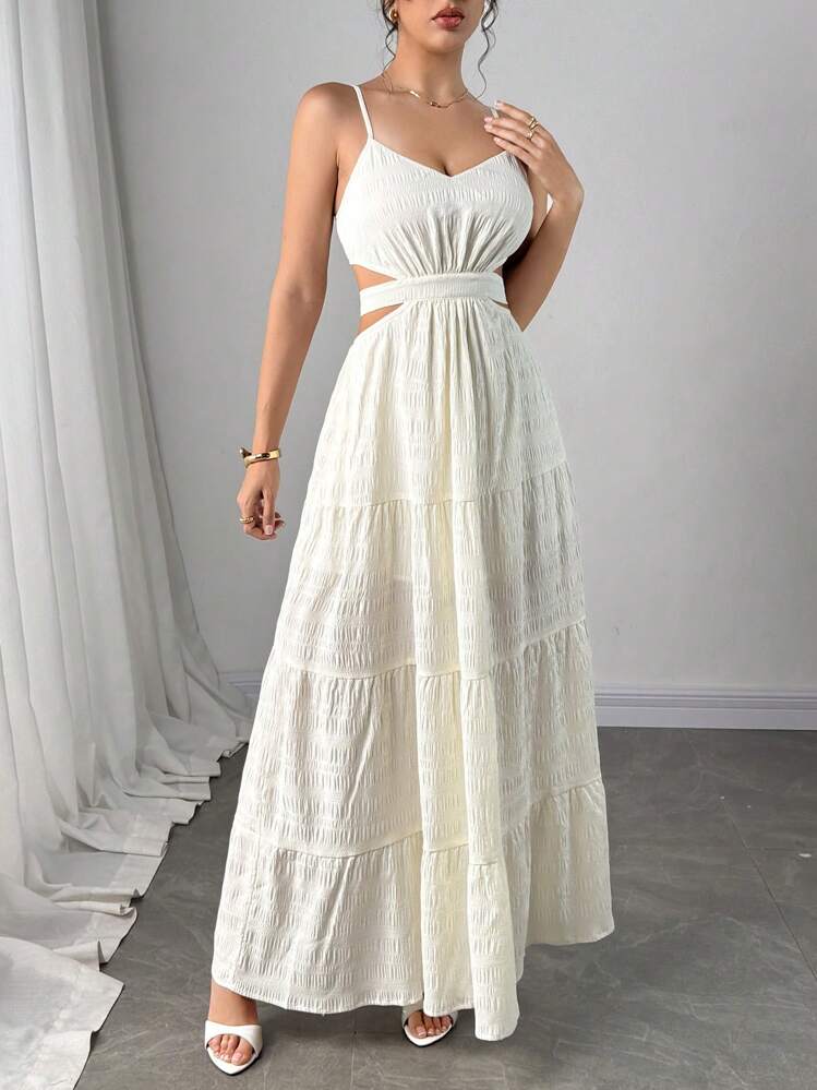 Ta piękna sukienka maxi w kolorze ecru z cut-outami zapewni Ci wygodę i elegancję na każdą okazję. Posiada dekolt V oraz ramiączka, które dodają jej subtelności. Idealna propozycja na lato!