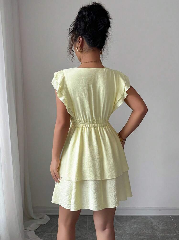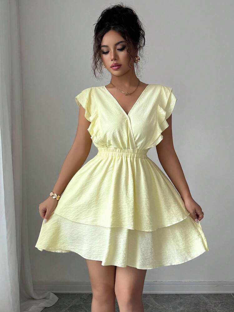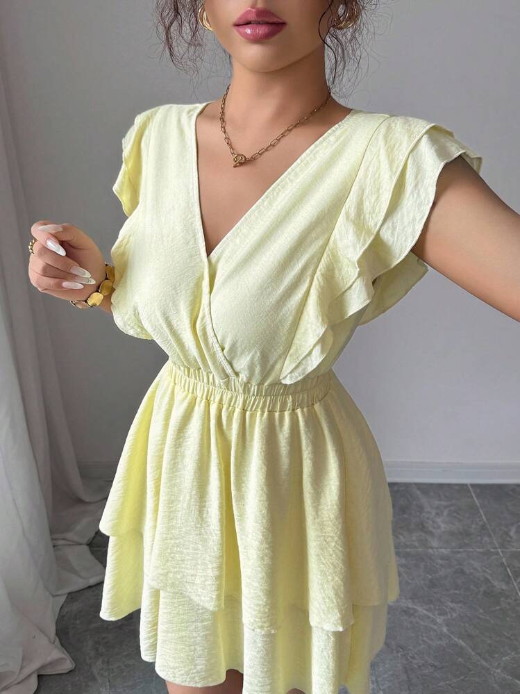 Żółta sukienka z falbanami to idealna propozycja dla kobiet lubiących kolorowe i kobiece stylizacje. Kopertowy dekolt i krótki rękaw dodają jej szyku i elegancji. Doskonale sprawdzi się na wiele okazji.