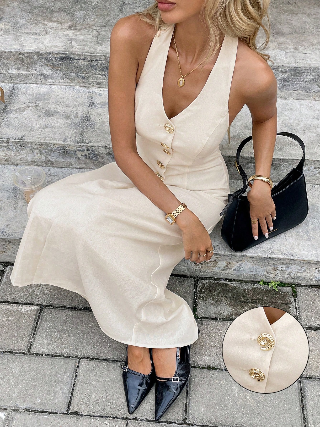 Ecru sukienka midi w eleganckim kolorze ecru, z ozdobnymi złotymi guzikami. Dekolt w formie odkrytych pleców dodaje uroku i kobiecości. Bez rękawów, idealna na letnie wieczorne wyjścia.