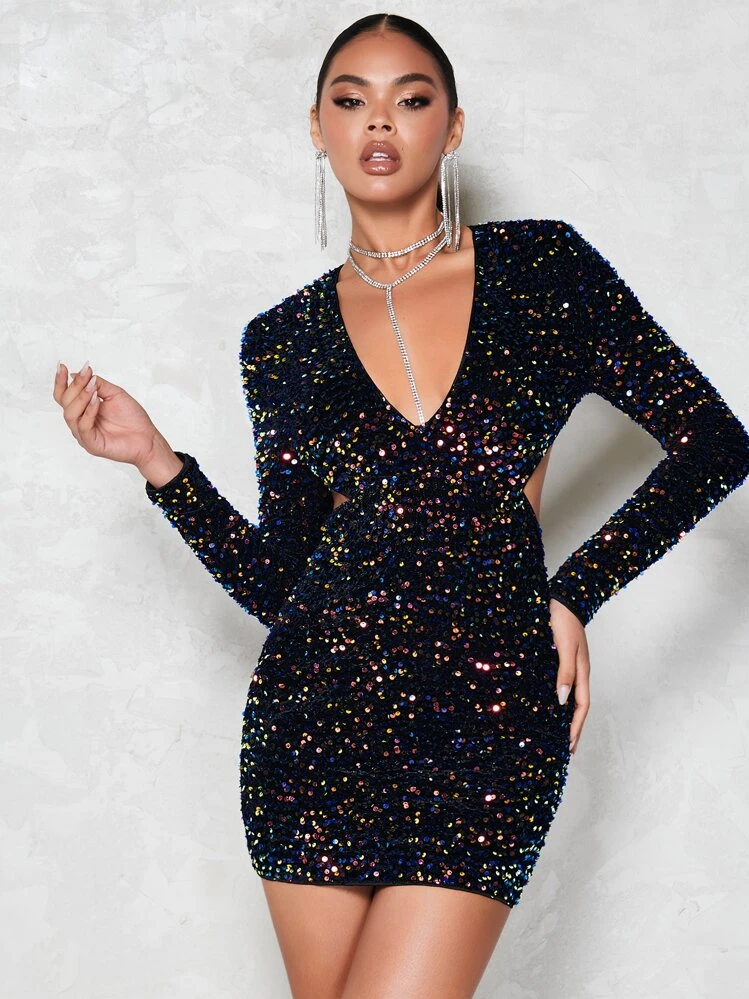Seksowna mini sukienka z cekinami w kolorze czarnym. Posiada odkryte plecy oraz długie rękawy, co nadaje jej wyjątkowego uroku. Perfect for a night out!