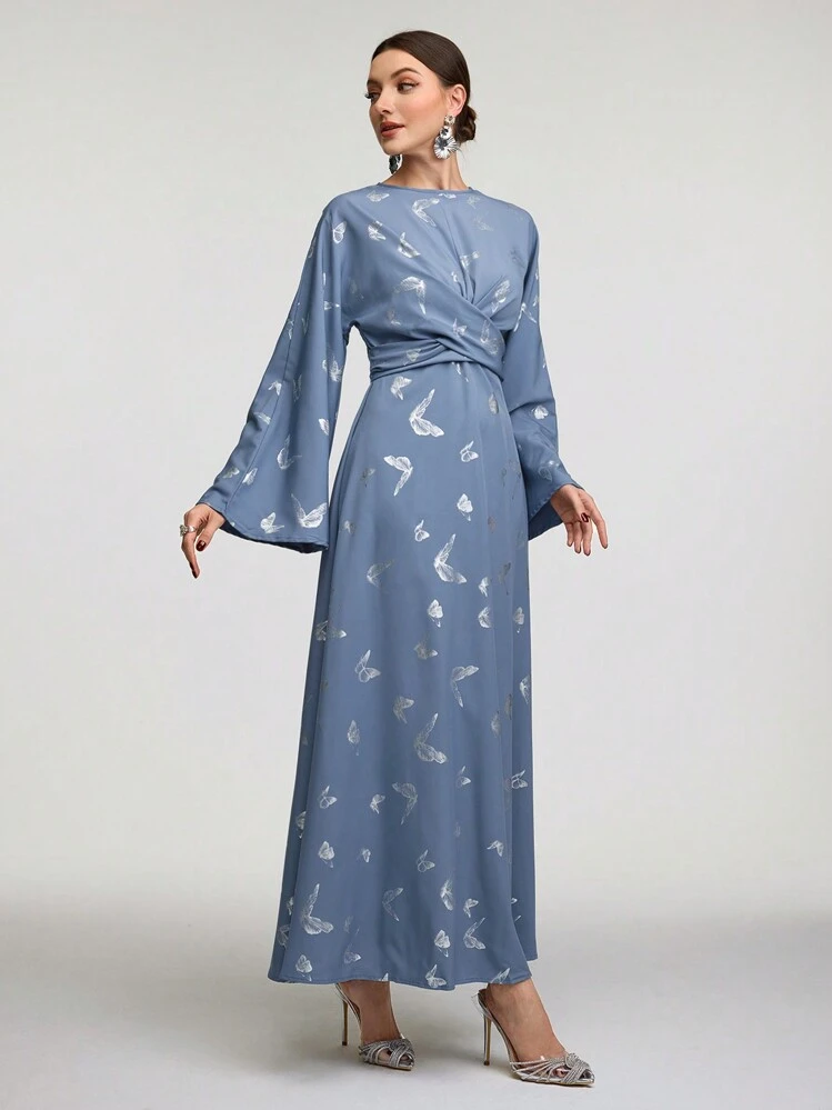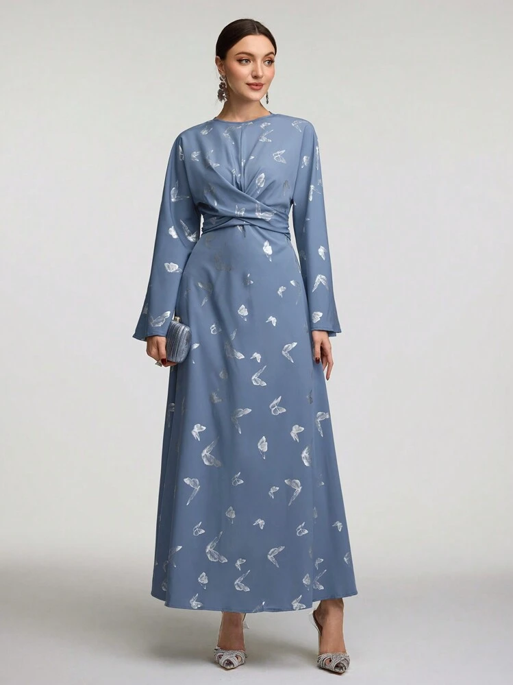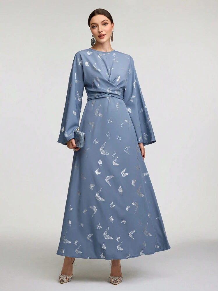 Wygodna i kobieca sukienka maxi o trapezowym kroju, uszyta z lekkiego materiału w niebieskim kolorze. Posiada okrągły dekolt i długi rękaw. Dzięki swojemu wzorowi oraz fasonowi doskonale sprawdzi się na różne okazje.