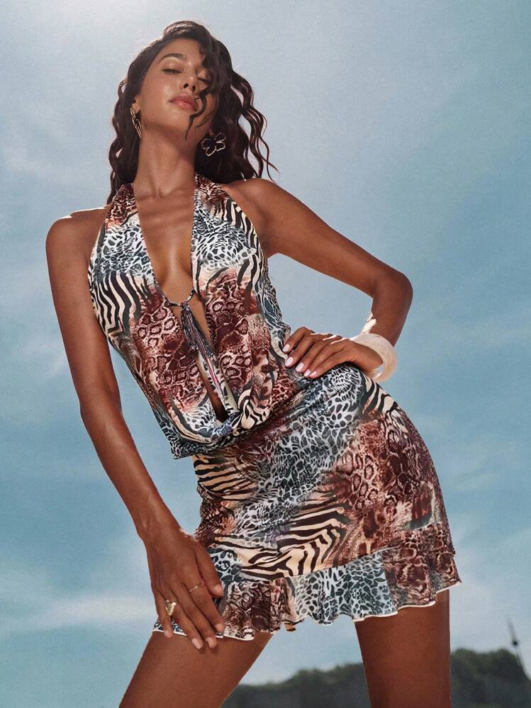 Ta piękna mini sukienka zachwyci Cię swoim kolorowym wzorem. Głęboki dekolt i brak rękawów dodają jej seksapilu i sprawiają, że jest idealna na imprezę lub letnią randkę.