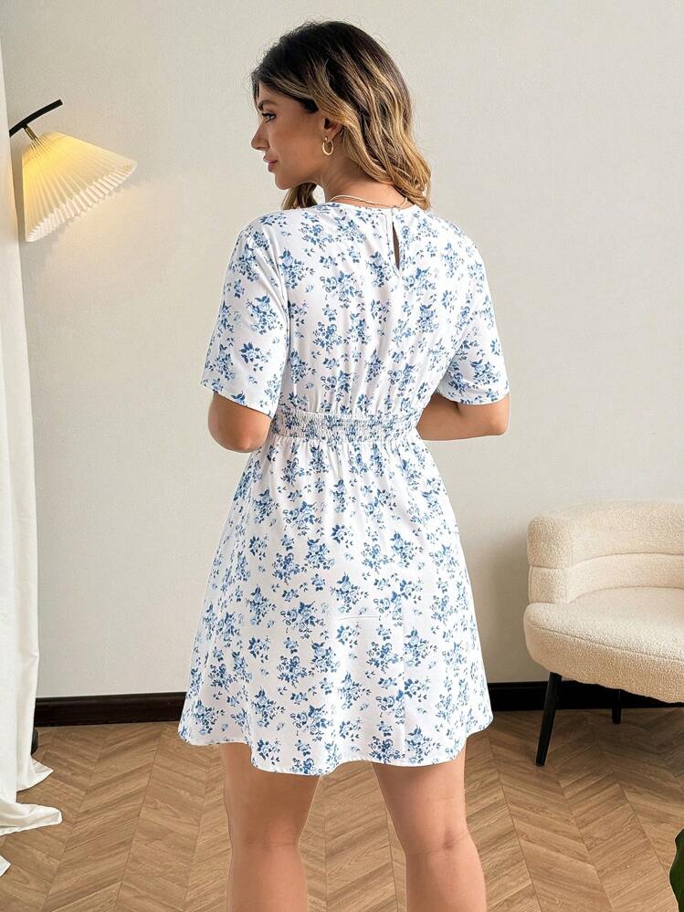 Biała sukienka mini w delikatny wzór. Wykonana z lekkiego i przewiewnego materiału. Posiada okrągły dekolt oraz krótkie rękawy. Doskonały wybór na letnie dni!