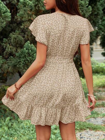Seksowna brązowa sukienka mini z wzorem paska. Wykonana z lekkiego i przewiewnego materiału, idealna na letnie dni. Kopertowy dekolt i krótkie rękawy dodają uroku i kobiecości.