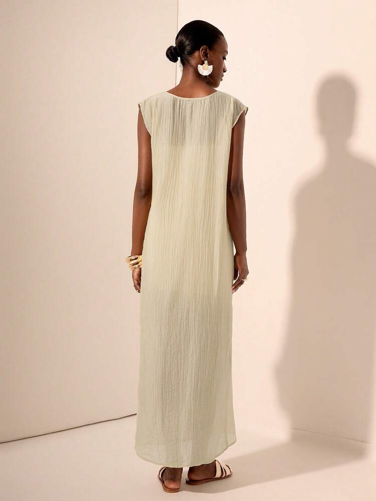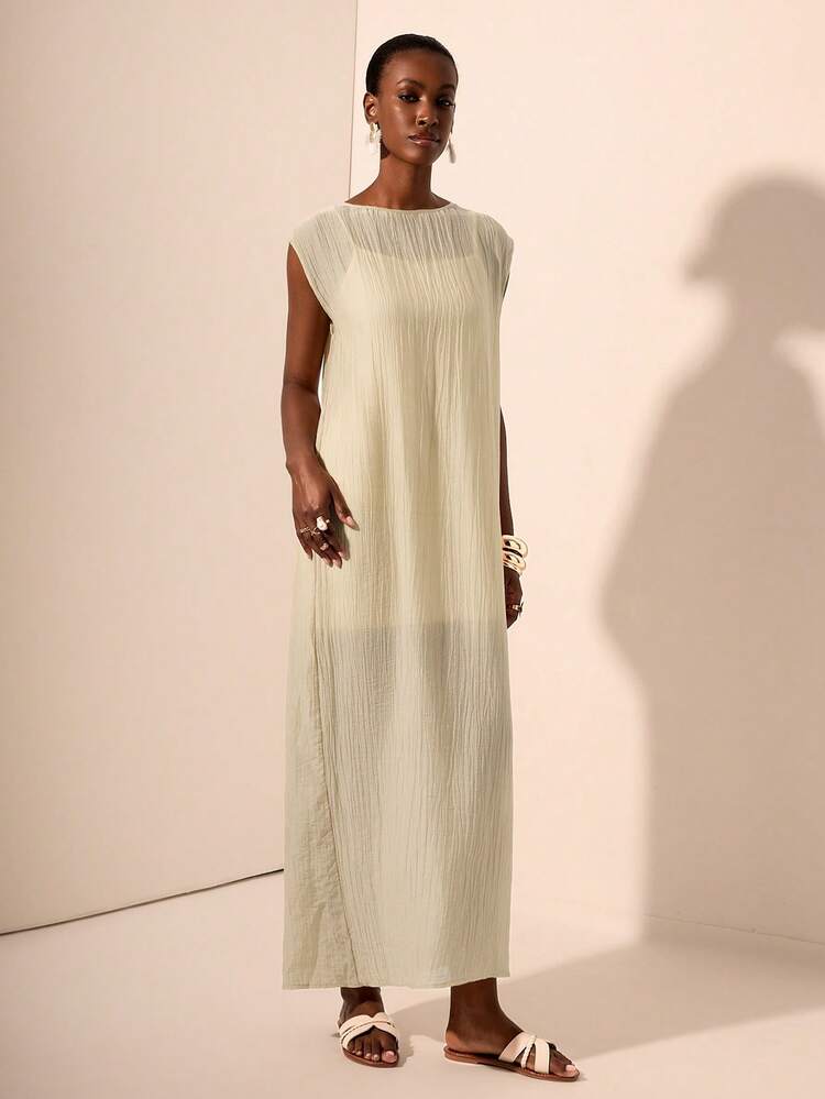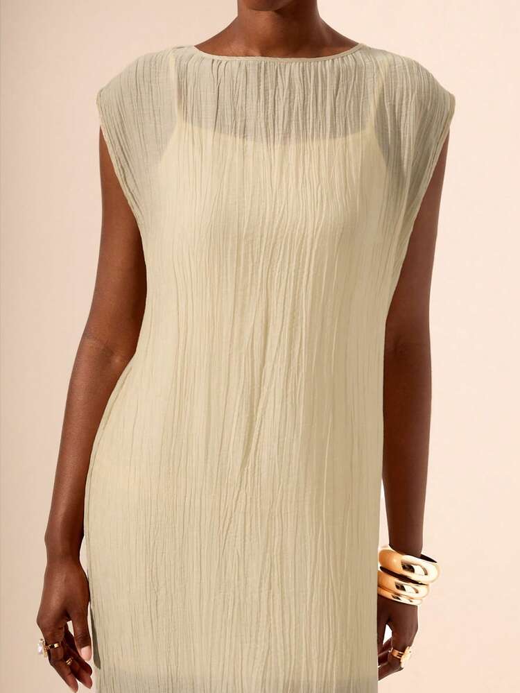 Elegancka beżowa sukienka o krótkich rękawach i dekolcie w kształcie łódki. Wykonana z wysokiej jakości materiału, który pięknie układa się na ciele, podkreślając kobiecą sylwetkę. Idealna na ciepłe letnie dni.
