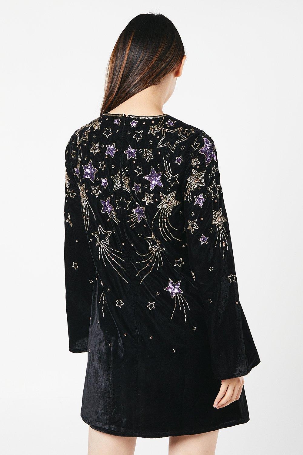 Elegancka czarna sukienka z weluru, ozdobiona cekinami, doskonale sprawdzi się na wieczorne wyjścia. Posiada okrągły dekolt i długi rękaw, co nadaje jej klasycznego charakteru.