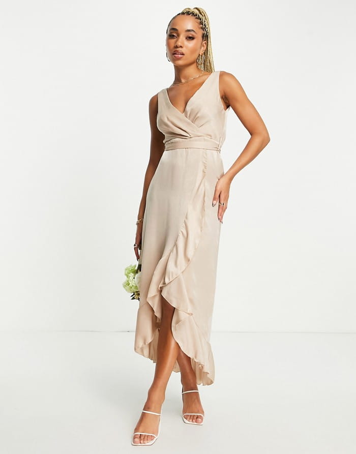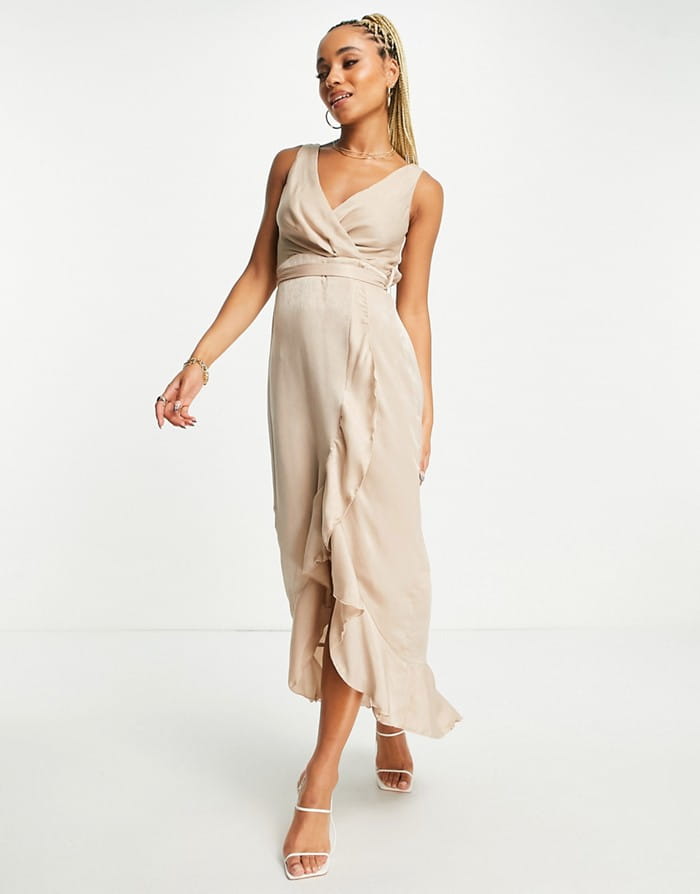 Beżowa satynowa sukienka pasek (40)