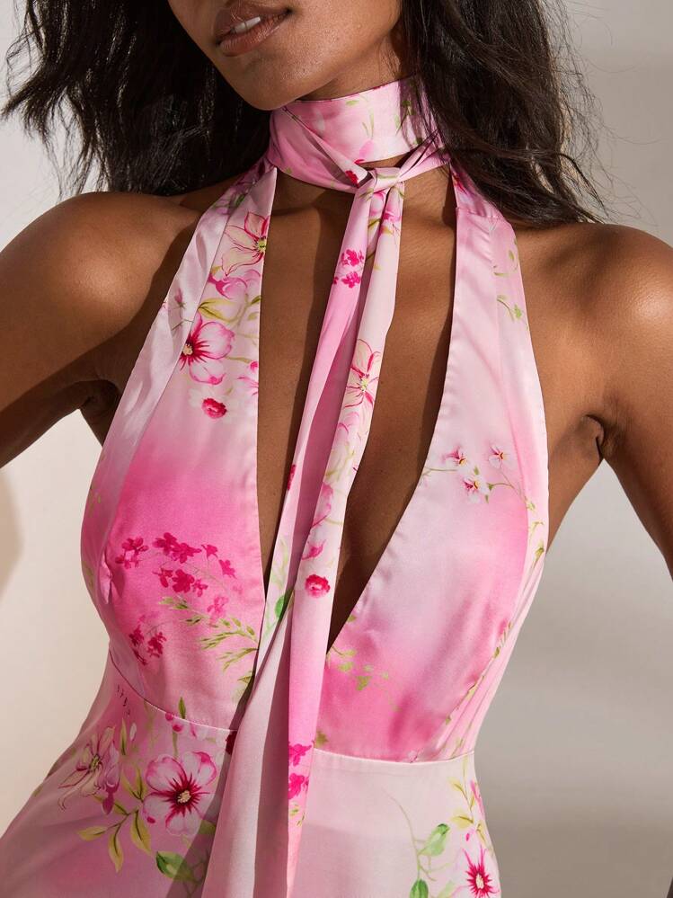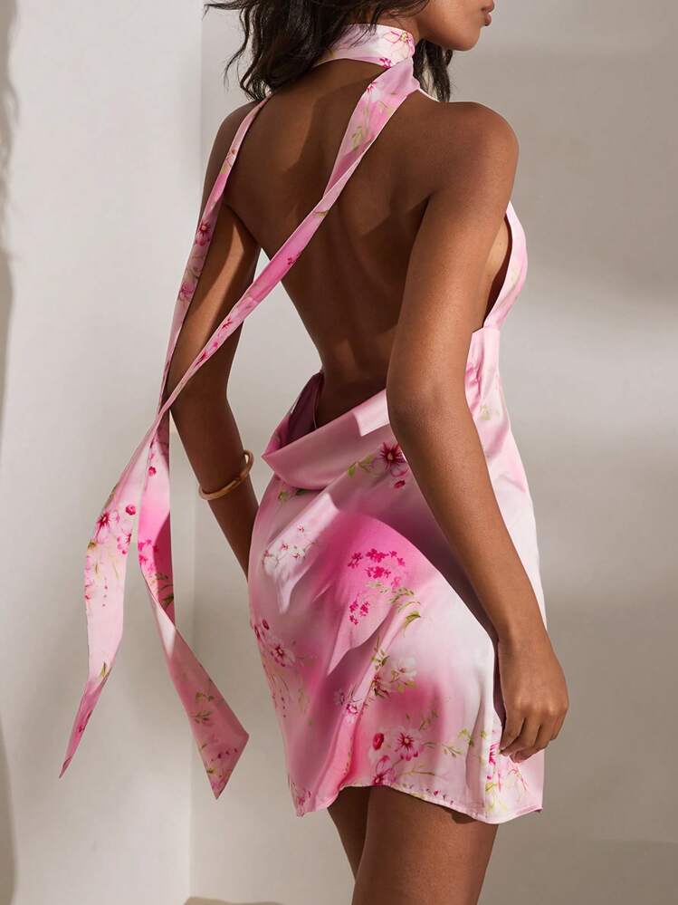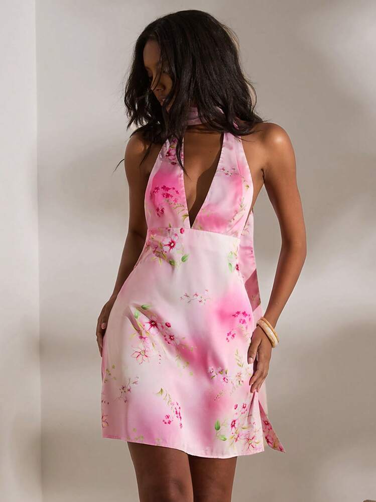 Różowa sukienka z mini kwiatowym wzorem, idealna na letnie dni. Posiada odkryte plecy, które dodają jej dziewczęcego charakteru. Bez rękawów, idealna dla kobiet lubiących wygodę i spinki w ciepłej aurze.