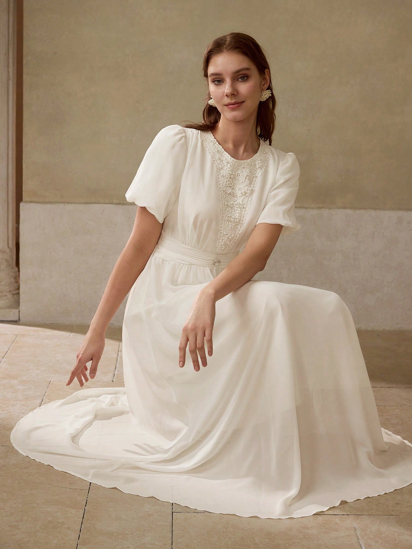 Elegancka sukienka w kolorze ecru to idealna propozycja na wyjątkowe okazje. Pięknie prezentuje się dzięki okrągłemu dekoltowi i krótkim rękawom. Dodatkowo kolor ecru jest niezwykle uniwersalny i pasuje do wielu innych odcieni.