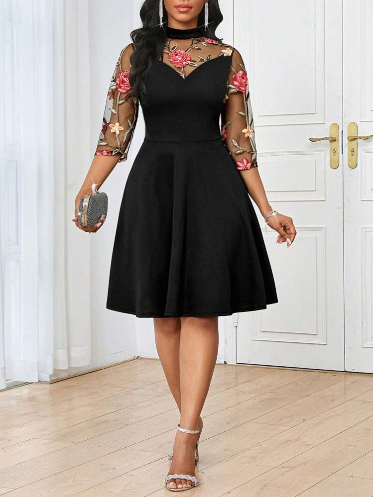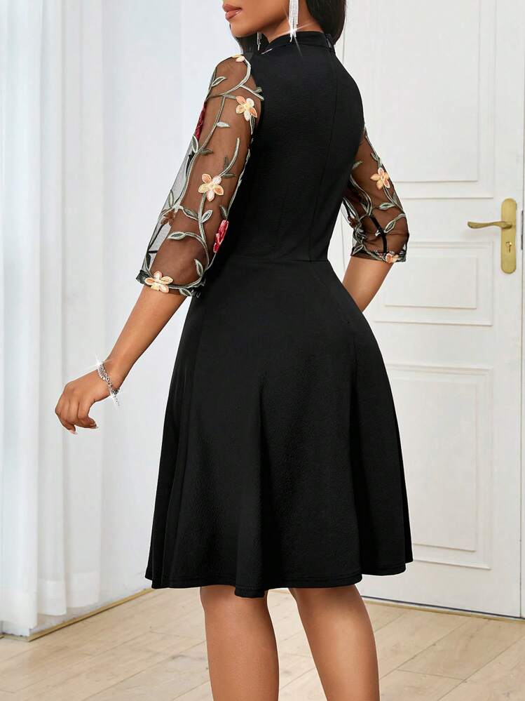 Elegancka czarna sukienka hafty o stójce i 3/4 rękawach to idealna propozycja na wieczorne wyjścia. Wysokiej jakości materiał w połączeniu z pięknymi haftami dodadzą uroku i klasy każdej stylizacji.