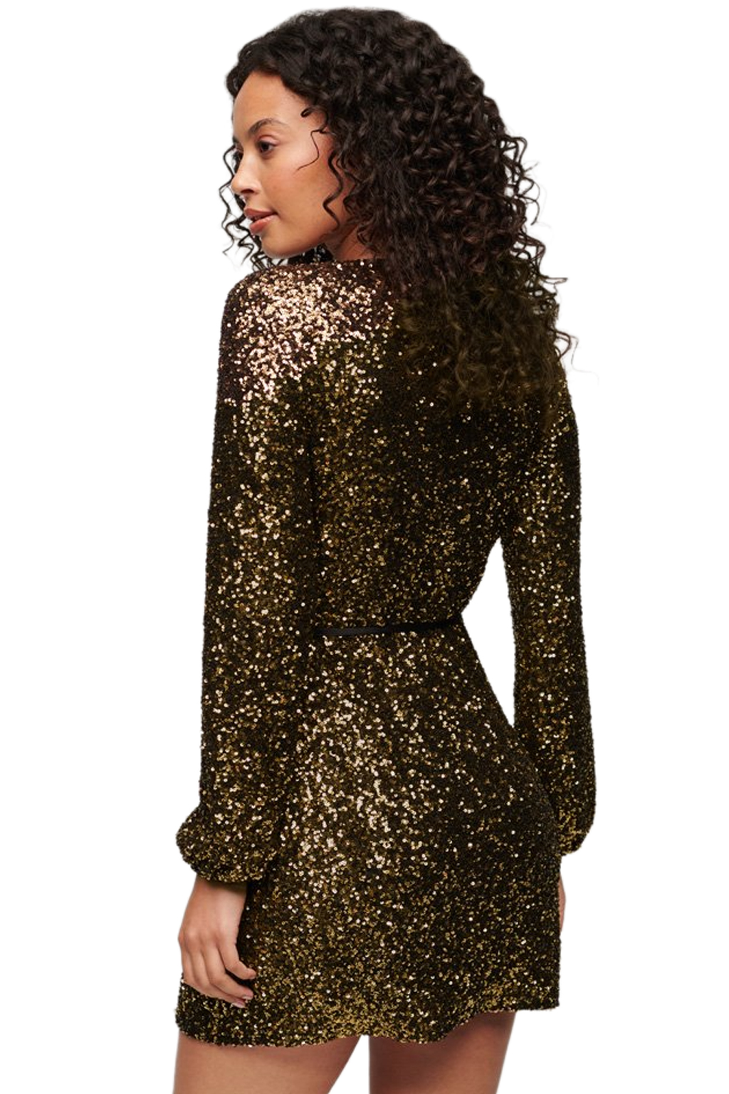 Ta cekinowa sukienka mini jest idealna na imprezę. Ma kopertowy dekolt i długi rękaw, co dodaje jej elegancji.
