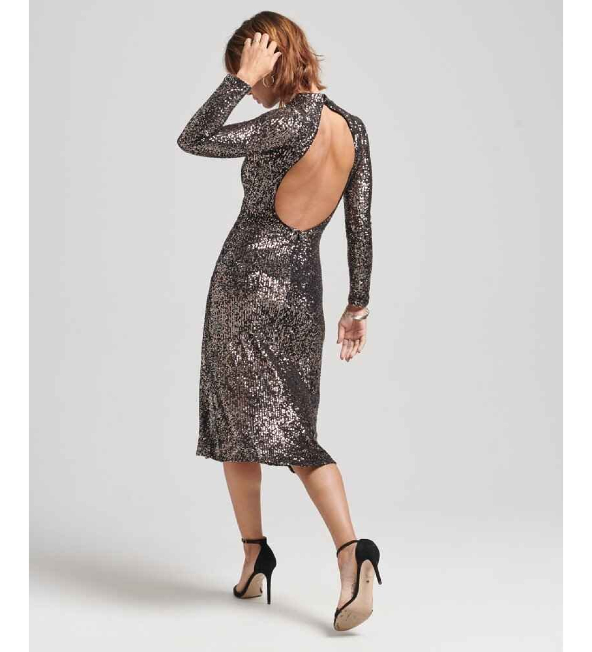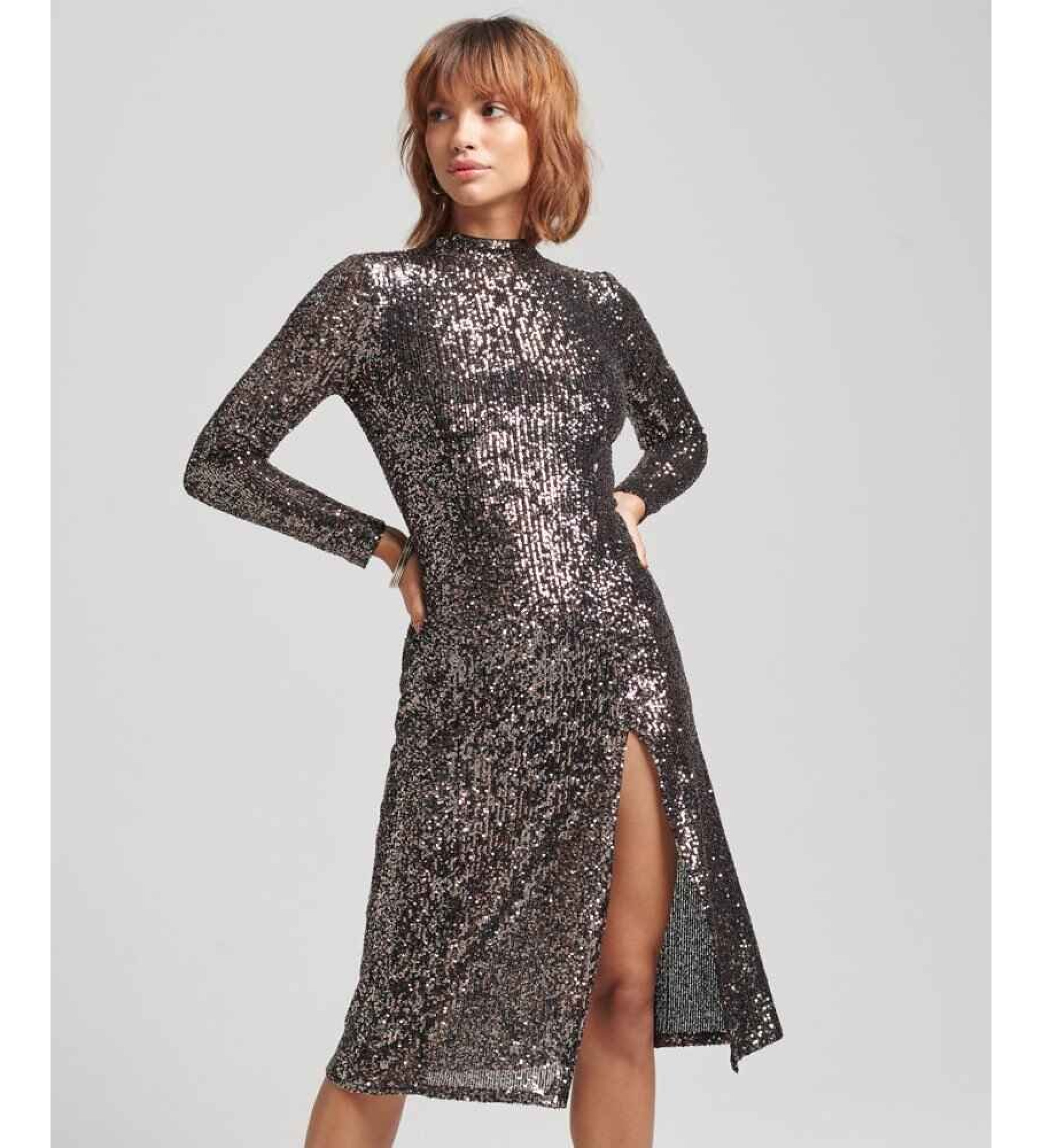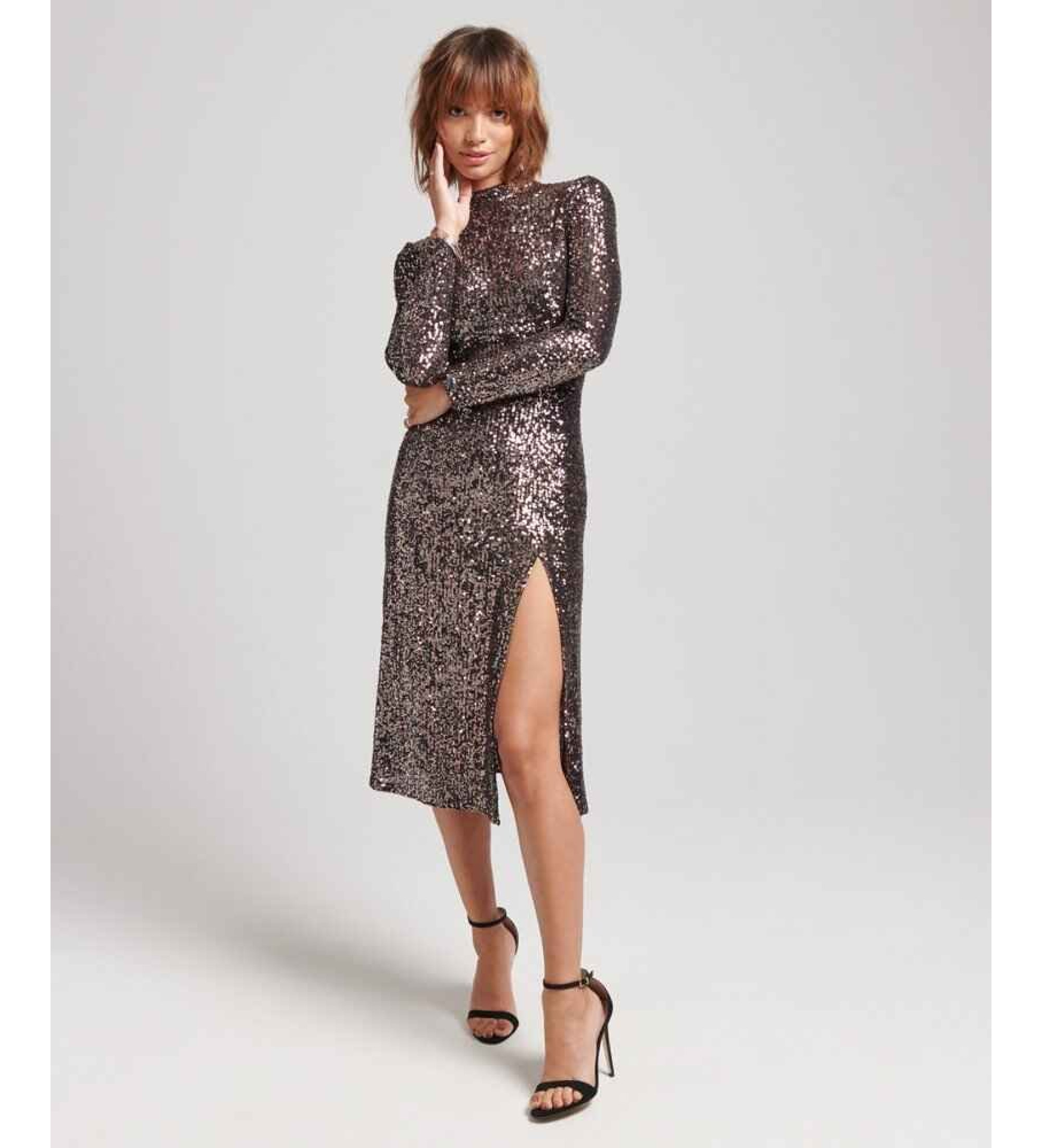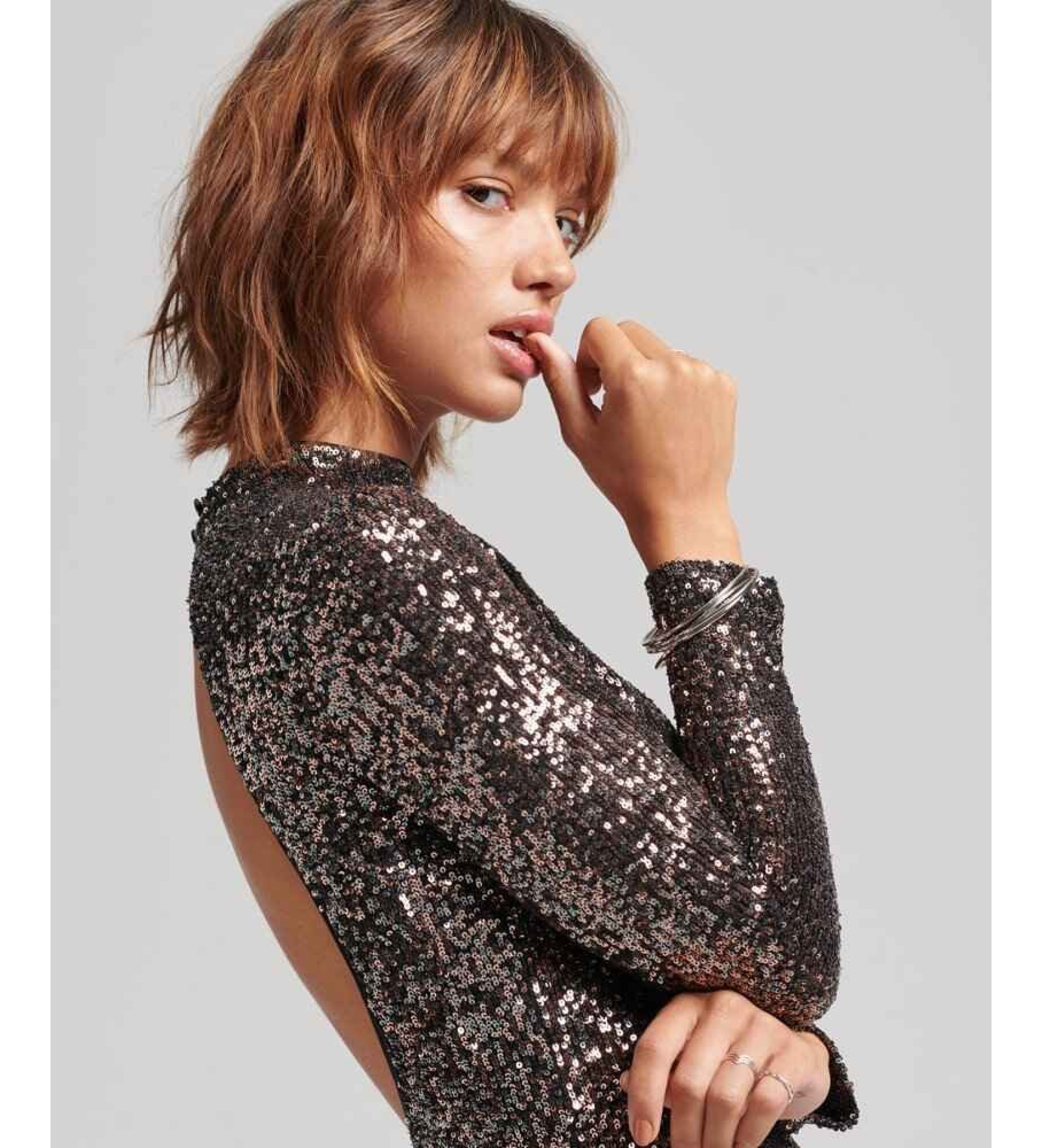 Kokieteryjna sukienka z cekinami w wielu kolorach zapewni Ci świetlisty blask na każdej imprezie. Wygodny dekolt typu stójka i długi rękaw z wycięciami sprawią, że poczujesz się oszałamiająco.
