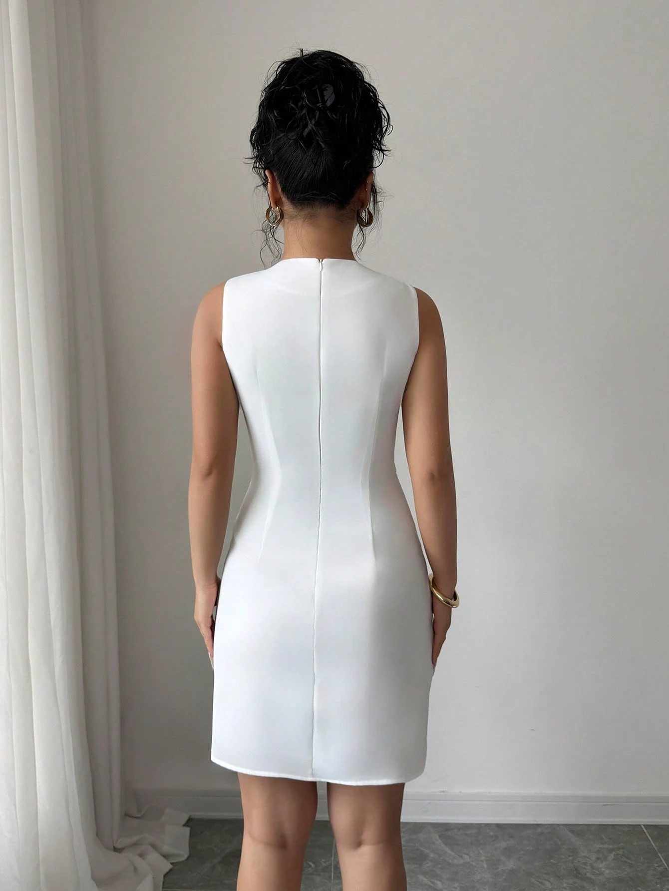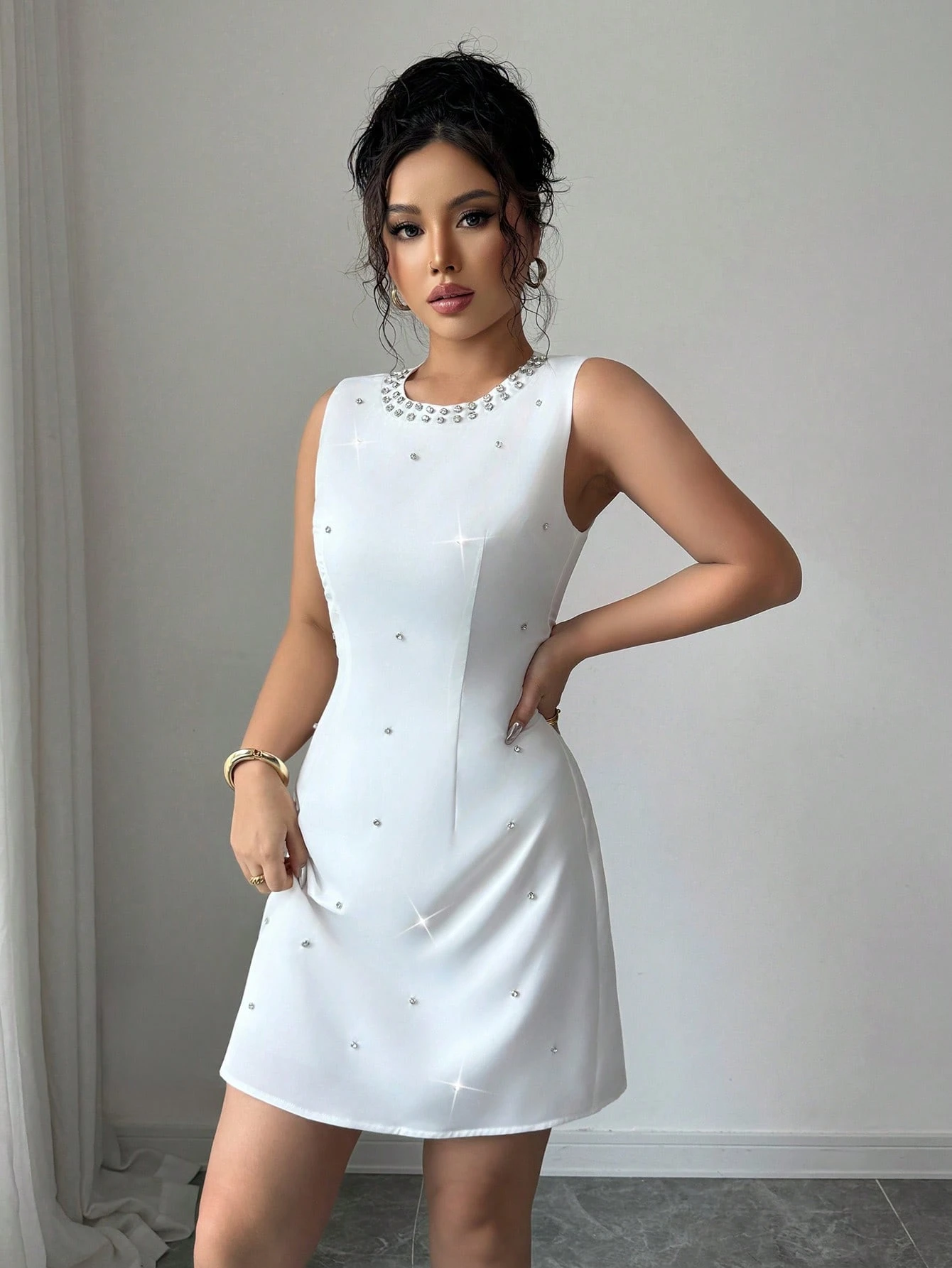 Elegancka biała sukienka mini pokryta błyszczącymi cyrkoniami. Idealna na letnie imprezy i wieczorne wyjścia. Posiada okrągły dekolt i bezrękawnik, podkreślając kobiecą sylwetkę.