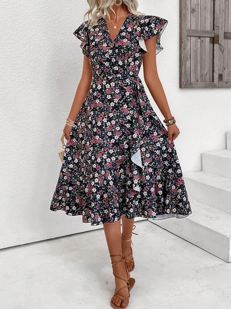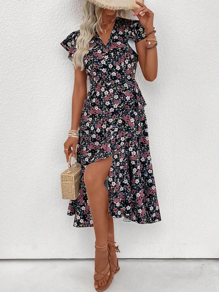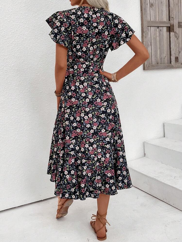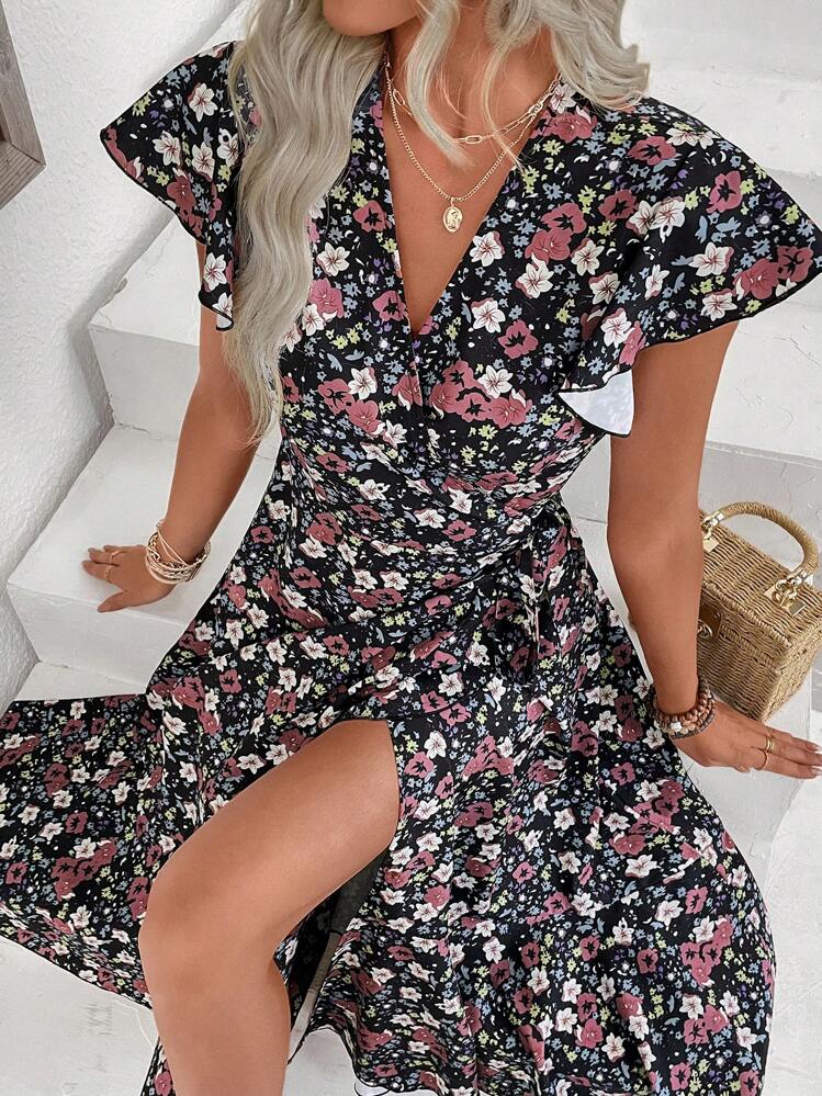 Czarna sukienka z kopertowym dekoltem i krótkimi rękawami to ponadczasowy element garderoby, który podkreśli kobiecą sylwetkę. Wzorzysty motyw dodaje jej szlachetnego charakteru, sprawiając, że będzie idealnym wyborem na wiele okazji.