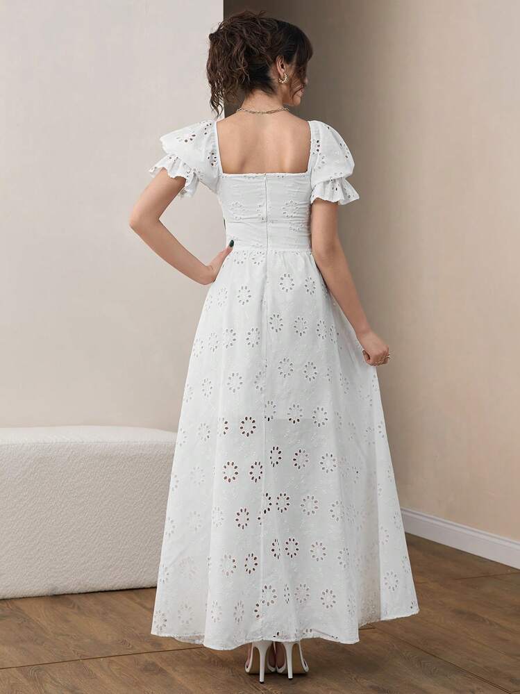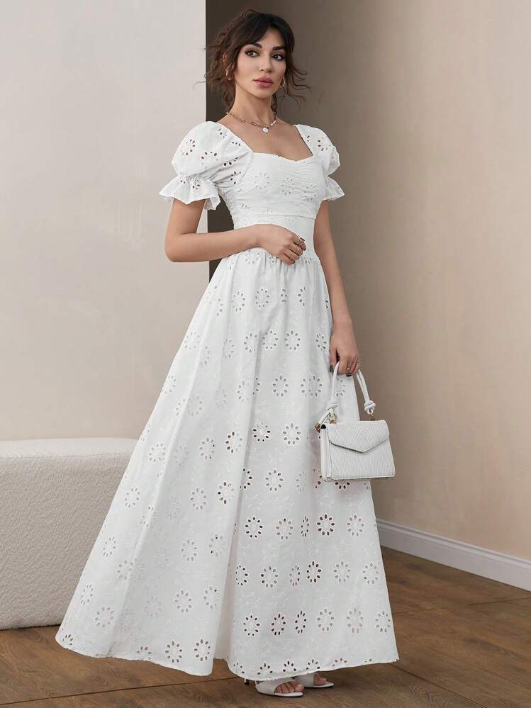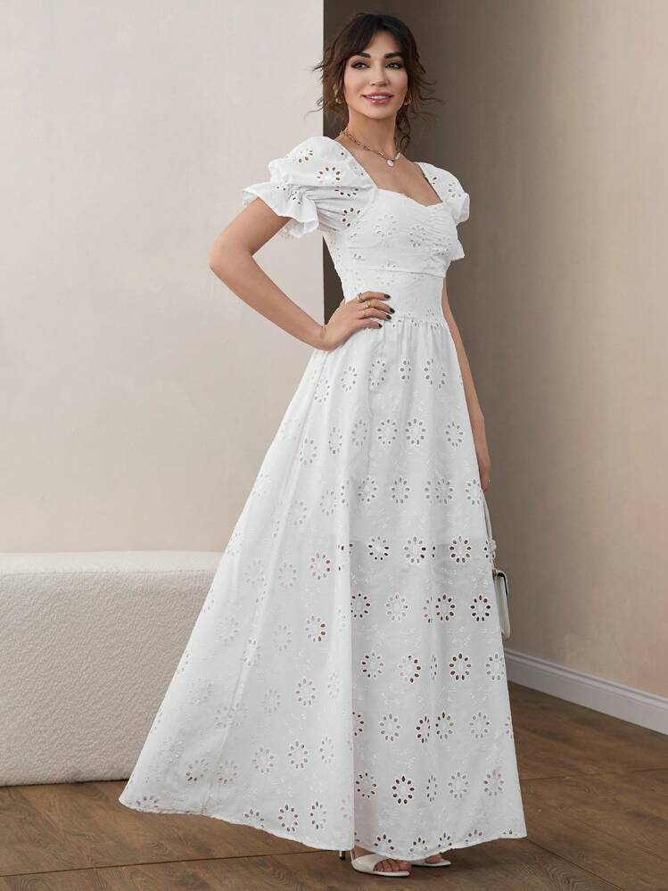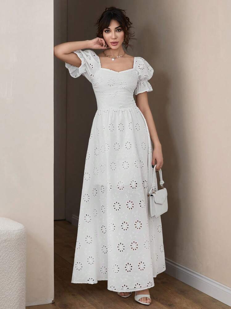 Ta biała maxi sukienka ażurowa jest idealna na spacer po plaży lub romantyczną kolację. Dekolt w kształcie serca oraz krótkie rękawy dodają jej kobiecego uroku. Świetnie sprawdzi się na letnie dni.
