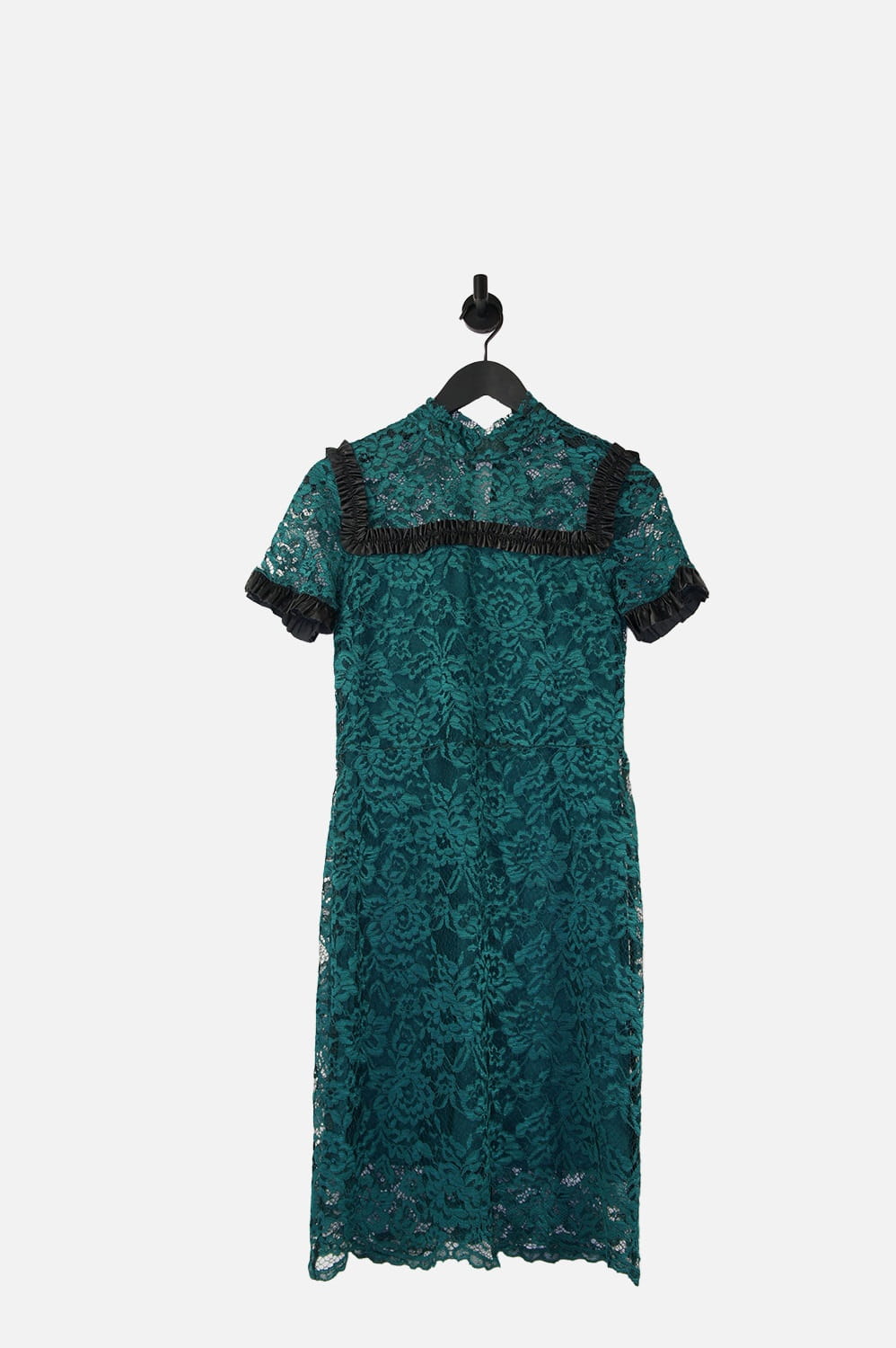 Elegancka sukienka o zielonym kolorze, wykonana z delikatnej koronki. Dekolt typu stójka oraz krótkie rękawy dodają uroku i szyku. Zapinana na zamek, idealna na wieczorne wyjścia lub specjalne okazje. Rozmiar włoski z metki producenta to 44.