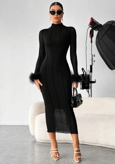 Czarna sukienka pióra to must-have dla eleganckiej kobiety. Wykonana z lekkiego i delikatnego materiału, ozdobiona piórami, nadaje charakteru i wyjątkowego wdzięku. Stójka i długi rękaw dodają szyku i klasy.
