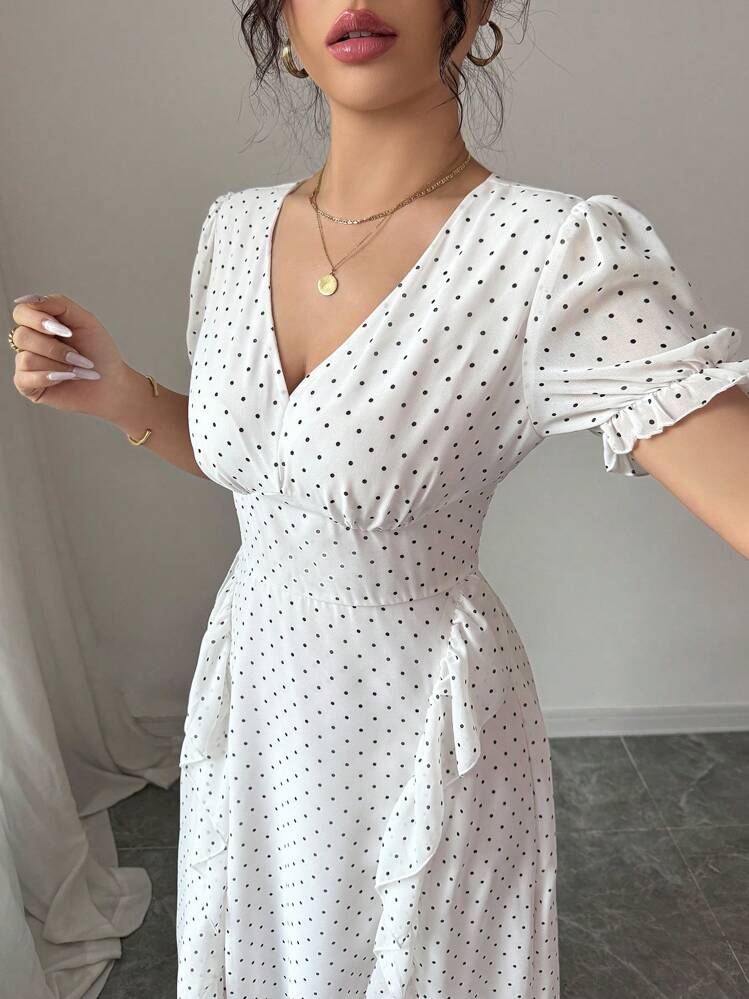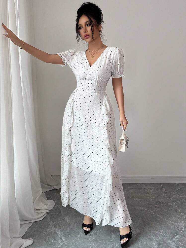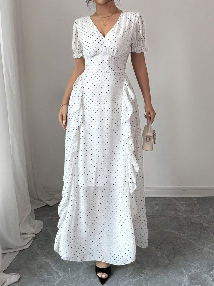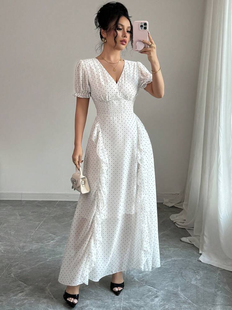 Elegancka biała maxi sukienka w kropki to idealna propozycja na lato. Posiada dekolt w serek lub V, oraz krótkie rękawy, które nadają jej lekkości i wygodnego noszenia. Świetnie sprawdzi się na letnie wyjścia i wieczorne spotkania.