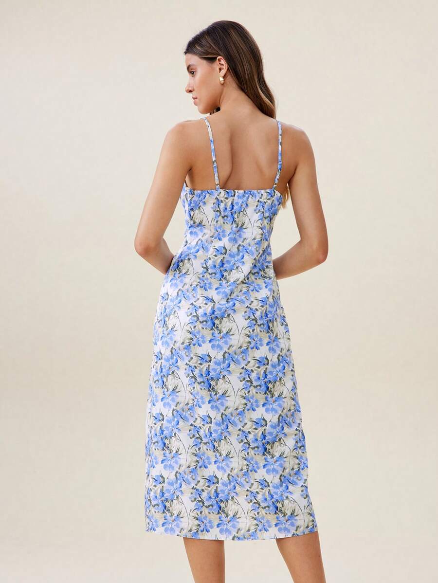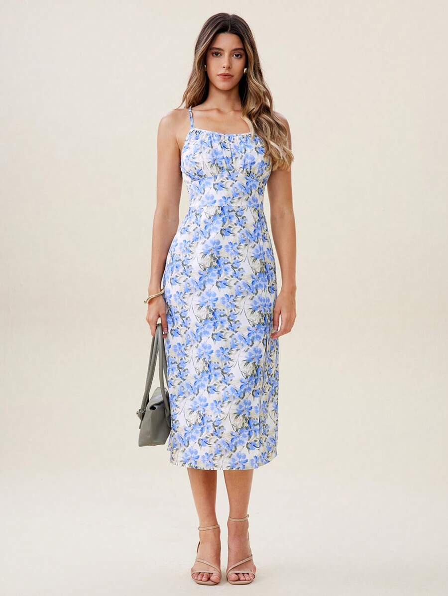 Prosta biała sukienka z wyraźnym wzorem i subtelnie wyprofilowanymi ramiączkami. Odkrywający dekolt w kształcie prostokąta dodaje uroku, a na ramiączkach znajdują się praktyczne obustronne uchwyty.