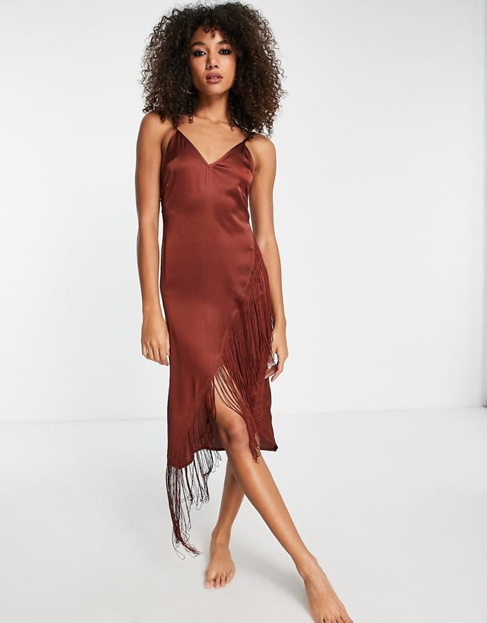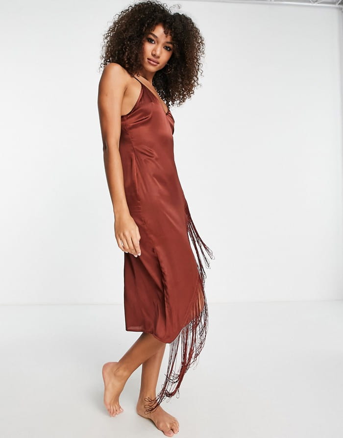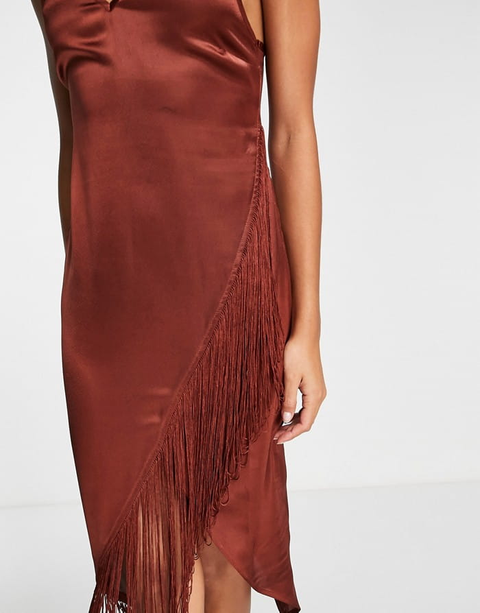 Elegancka brązowa sukienka z satyny, ozdobiona frędzlami, które nadają jej subtelny i wyjątkowy charakter. Dekolt typu serek lub V podkreśla kobiece atuty, a ramiączka dodają lekkości. Idealna na wieczorne wyjście.
