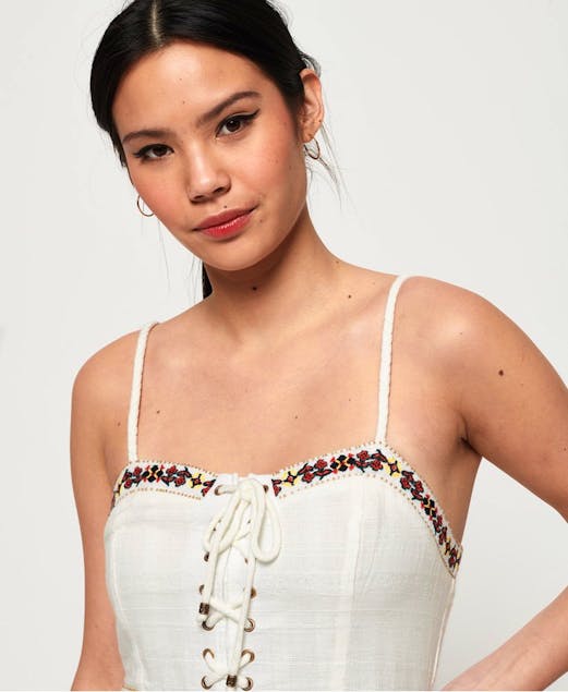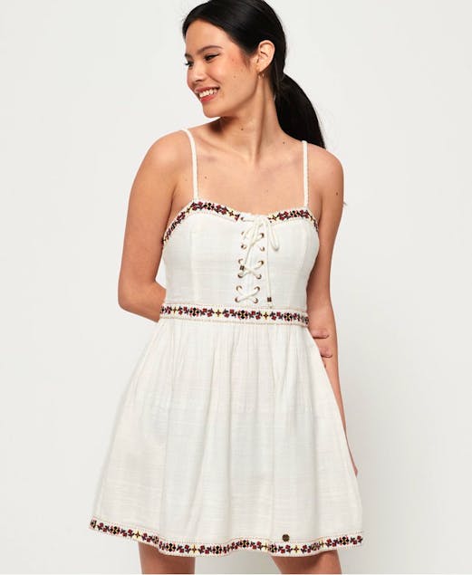 Urocza sukienka w kolorze białym z romantycznymi haftami. Dekolt w kształcie serca oraz delikatne ramiączka dodają jej subtelności. Doskonały wybór dla miłośniczek eleganckiego looku.