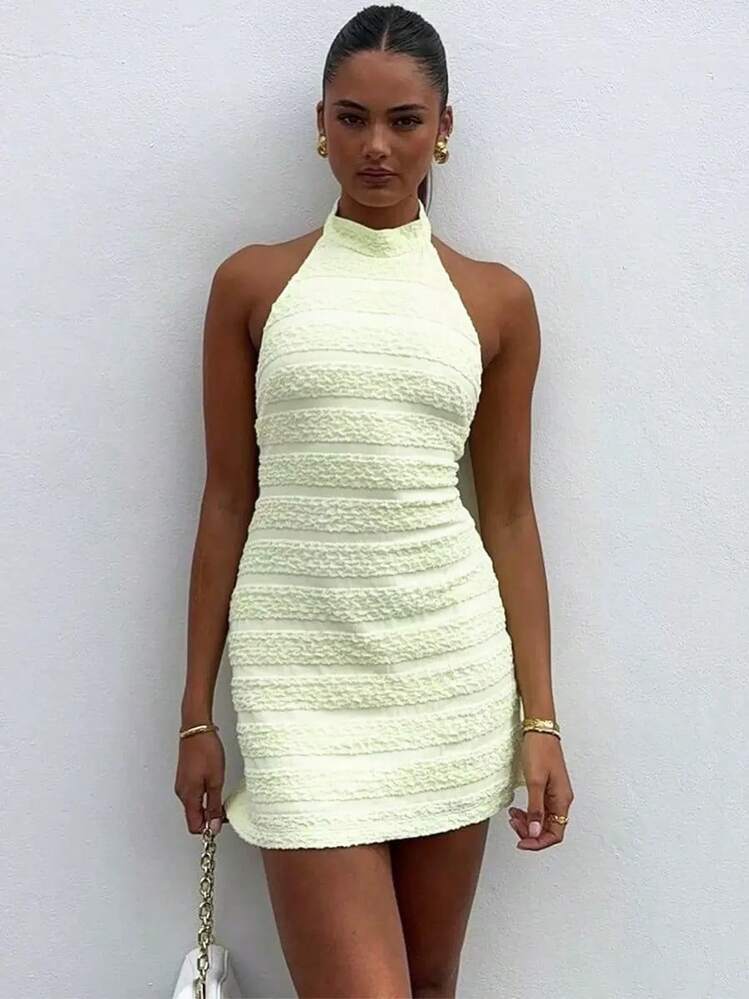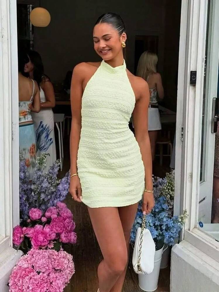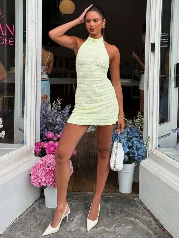 Ta neonowa sukienka mini w soczystym odcieniu zieleni to idealna opcja na zbliżające się letnie wyjścia. Odkryte plecy oraz bezrękawnikowy design dodają jej seksapilu i nadają się na wiele różnych okazji.